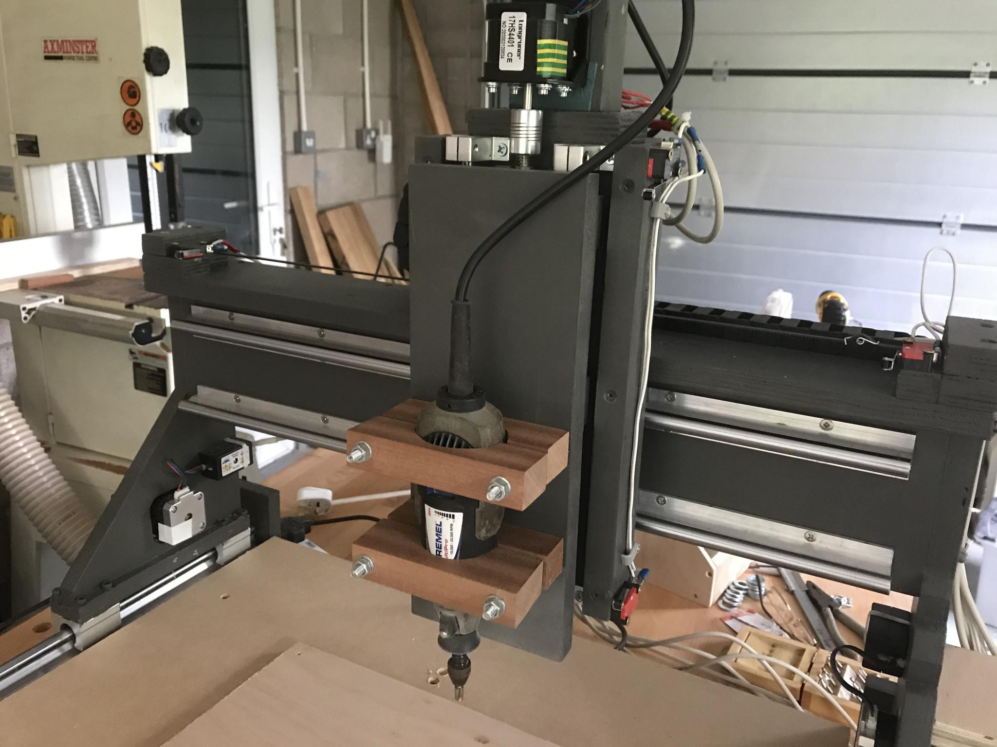 Hi, my name is Mike and I live in Devon recently retired from the software industry. Six weeks ago my wife bought me an Elegoo Arduino starter kit to keep me occupied during the Coronavirus lockdown. I made a few things using some Nema 17 stepper motors and then decided to make an XY plotter which went well. Now six weeks later I have a fully functioning CNC machine made out of plywood, softwood and some hardwood I had lying around. Of course I had to buy some rails SBR12 (ugh!) and some better stepper motor drivers TB6600 (?????) but apart from that most things I had lying around the workshop, including the Dremel I have attached. I have 4 Nema 17 (yes really) and they seem to drive the machine ok. I guess I have spent around £250 so far not counting the things I had lying around. I didn't sit down and design the machine I just made it up as I went along! My first piece of gcode was to cut a 20 tooth gear wheel (I sometimes mend old clocks and I'd like to use the machine to make the parts for a new build wooden clock). The accuracy of the gear wheel completely exceeded my expectations so I guess I'm now hooked. I'm treating this machine as a prototype so I'd like to learn as much as possible with this machine before scrapping it and starting again with some good spec items. Apologies if these questions have already been answered elsewhere but new forums can be a minefield for newbies like me.