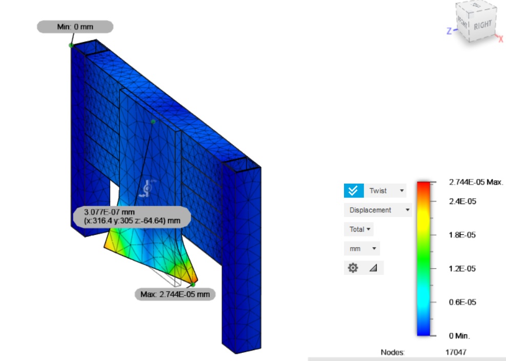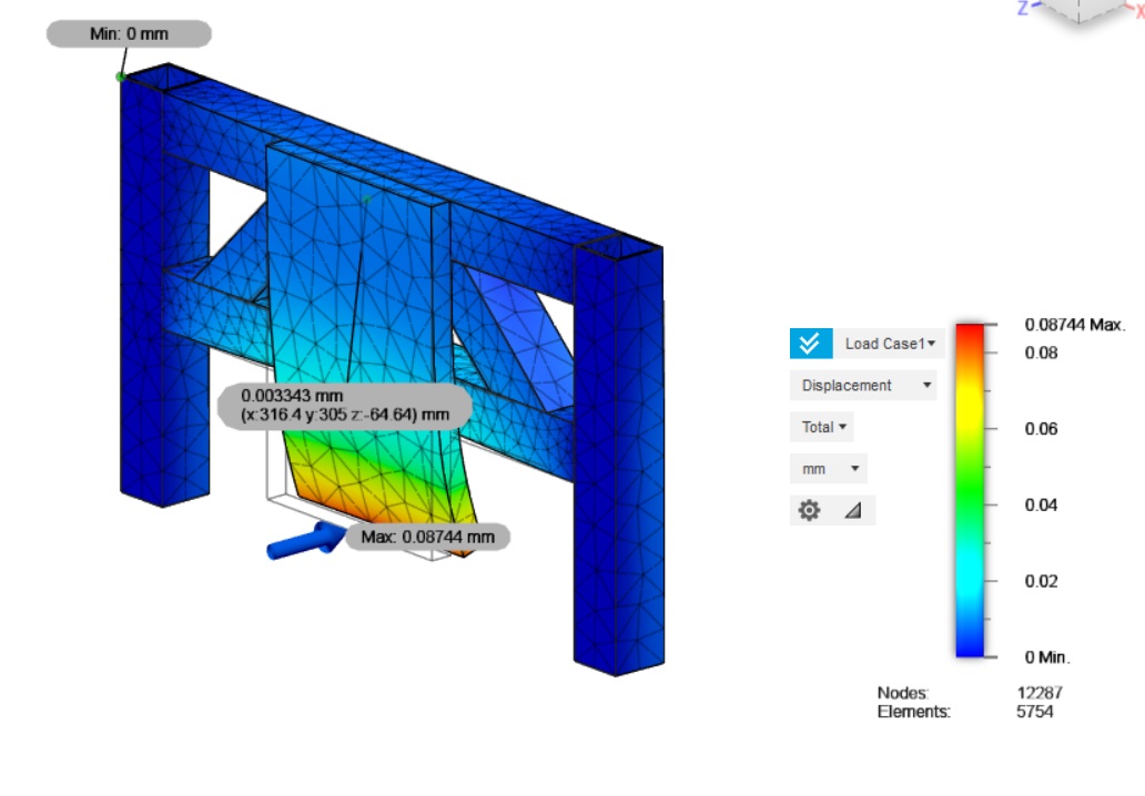Design A: Max displacement of 0.09 mm under a force of 100Kg