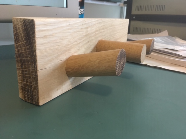 I have a design for some coat hooks I want to use in a few places around the house. This uses some rough green oak for the 'base' and 30mm bought-in machined dowels for the 'pegs'. I'm not much of a woodworker :) but I did a rough little prototype to check the design and figure out a fixture to drill the 30mm holes at a 30 degree angle on a drill press: