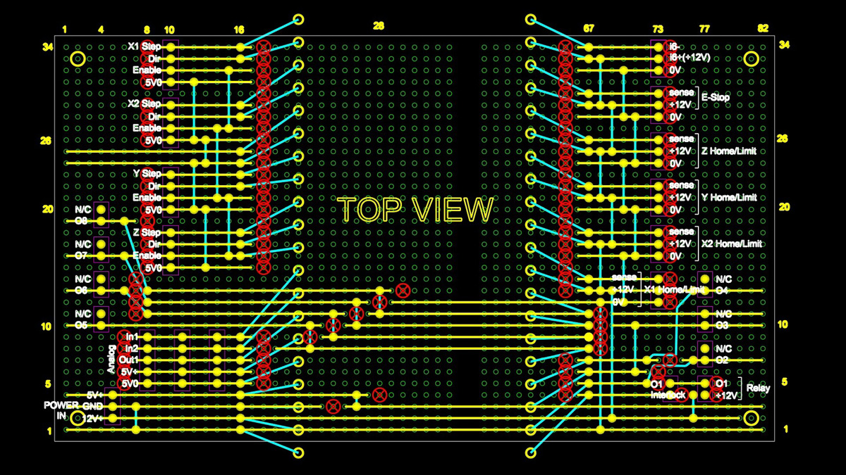 The result will have a header for each stepper with four pins for Step, Dir, Enable (all commoned to pin O17) and 0V. Providing +5V instead involves changing one jumper wire. Similar headers connect the proximity sensors with 0V, +12V (or 24V if I ever upgrade the PSU) and sensor output. Headers are also used for power in (one 3-pin connector for 0V, +5v, +12V) and the 8 isolated outputs, including a header for an interlock switch on O1 to prevent accidental starting of the spindle during tool changes. 5 pin headers (3 of) connect to the analog port allowing a single cable to connect to a board with two potentiometers on it or any combination of IN/OUT you require.