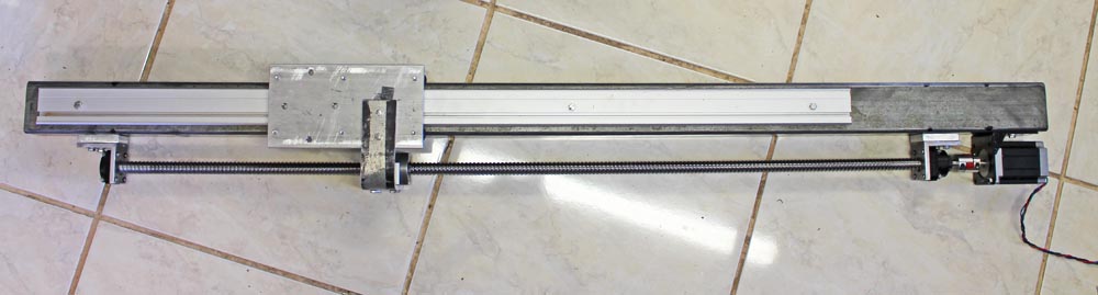 Previous experience with the wooden machines had shown up the difficulty of getting the rails and ballscrews suitably aligned all at the same time so I opted for a design based on two ‘linear actuators’ for the long axis. Each consists of a 1300mm long piece of 65mm square (I’d have preferred 75mm but the supplier didn’t have any at the time!) box section with a 1200mm SBR20 rail mounted on it and an 1100mm 1610 ballscrew plus direct drive stepper motor. The thinking was to get all these components aligned with each other as a single component and then move the whole structure to bring the complete machine into alignment without any readjustment of the rails/ballscrews relative positions. This has worked very well in practice but the overall rigidity of the structure is not as good as for other methods. The picture below shows an actuator with an earlier set of rails fitted.