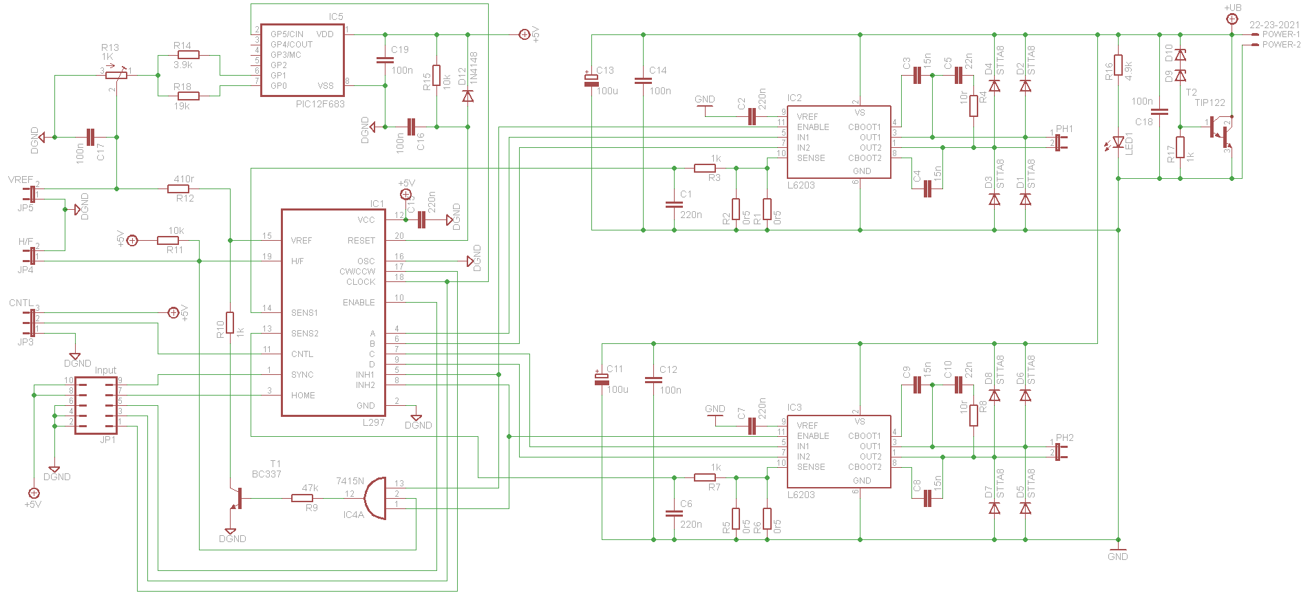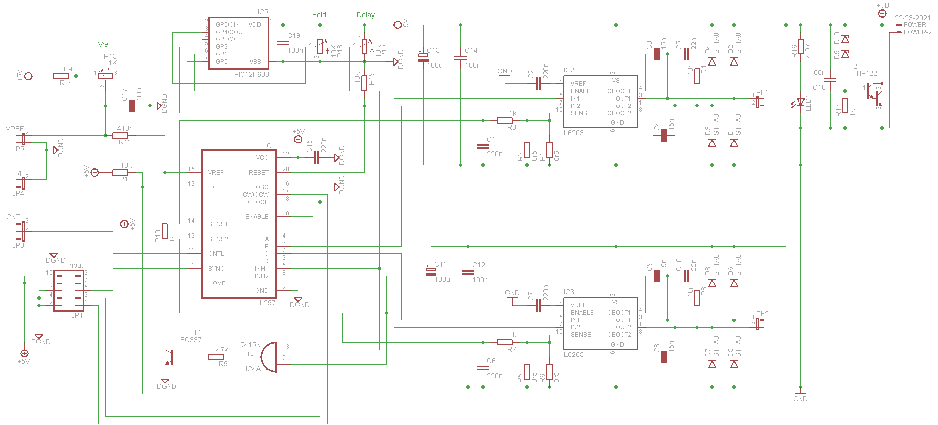 18-11-2009 #53Like so?Okay - just one slight change - pull the reset low with a 10k resistor. That will ensure that the L297 is in a reset condition before the PIC starts up.