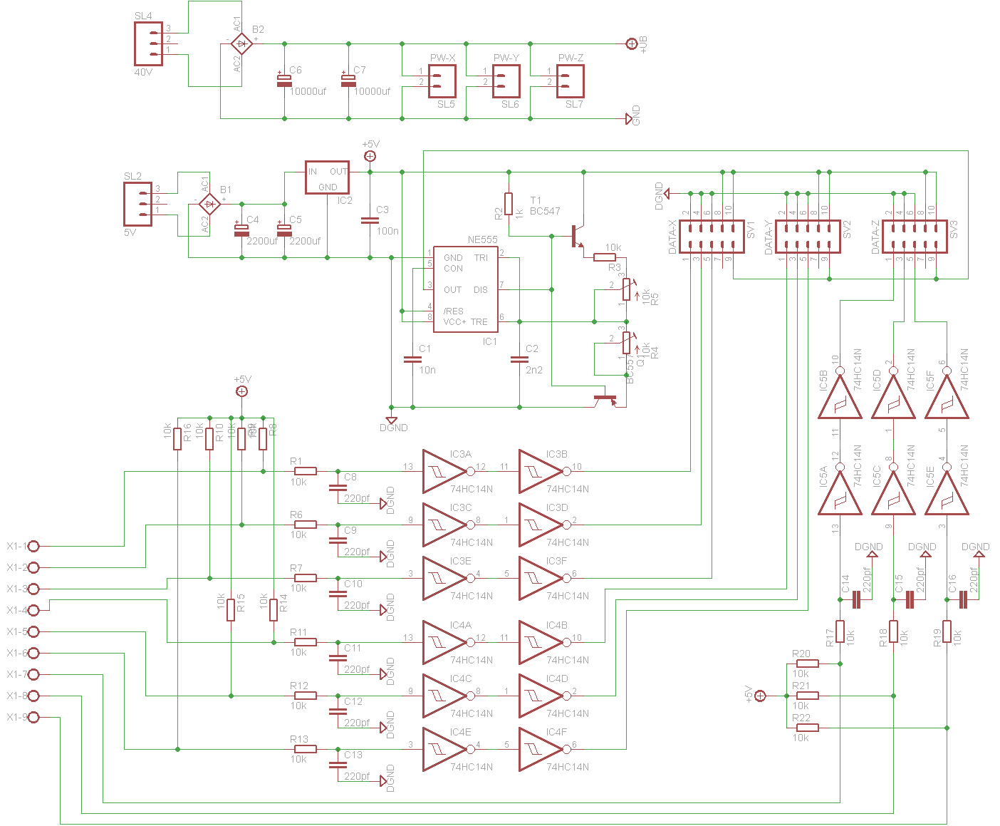 For the resistors inputs to the 'HC14s that are pulled high, I'd use a resistor pack for that - makes the track laying a lot easier.