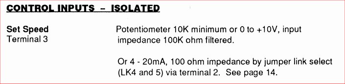 "Set speed Term 3: Potentiometer minimum or 0 to +10V, impedence 100K ohm filtered"