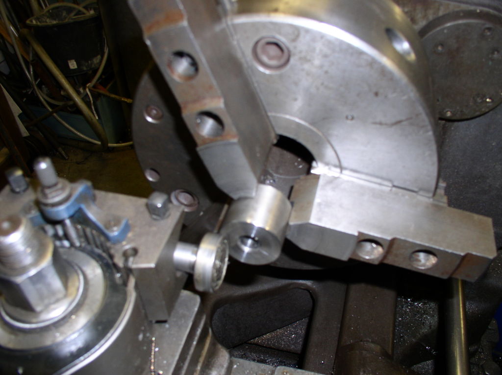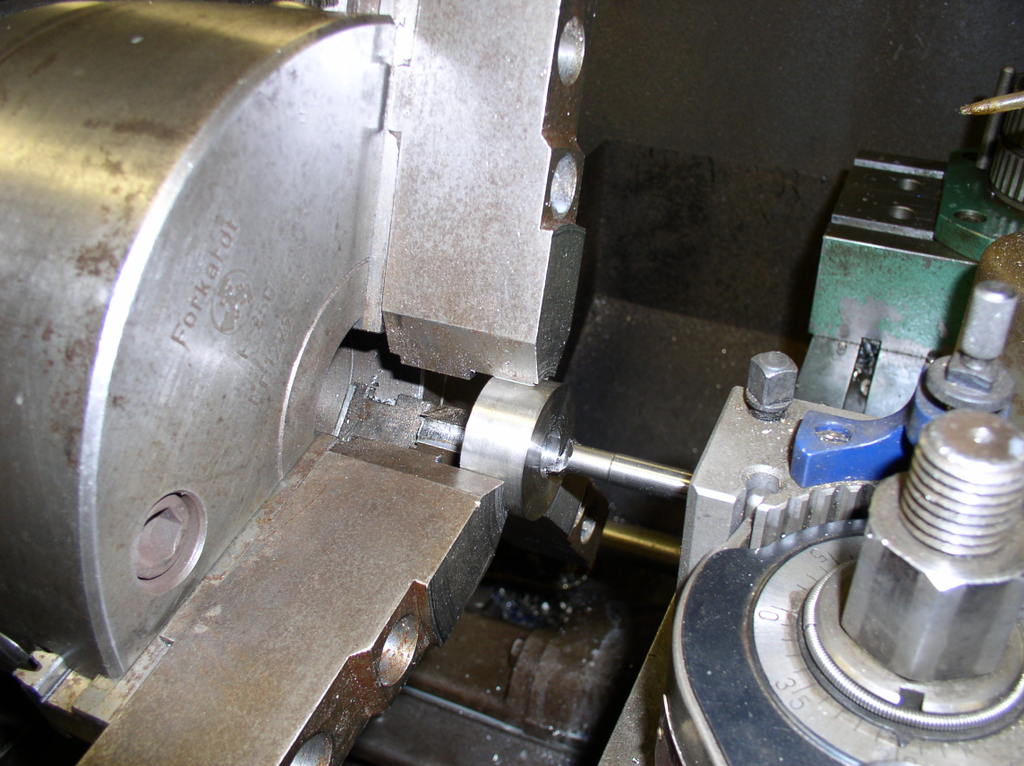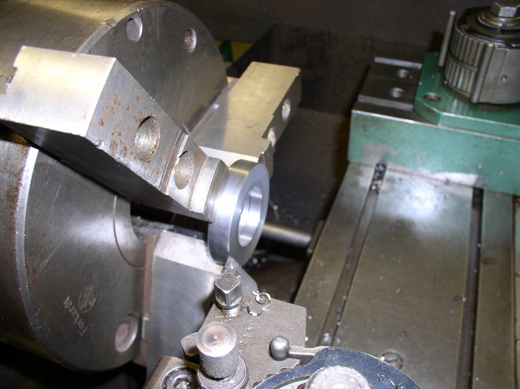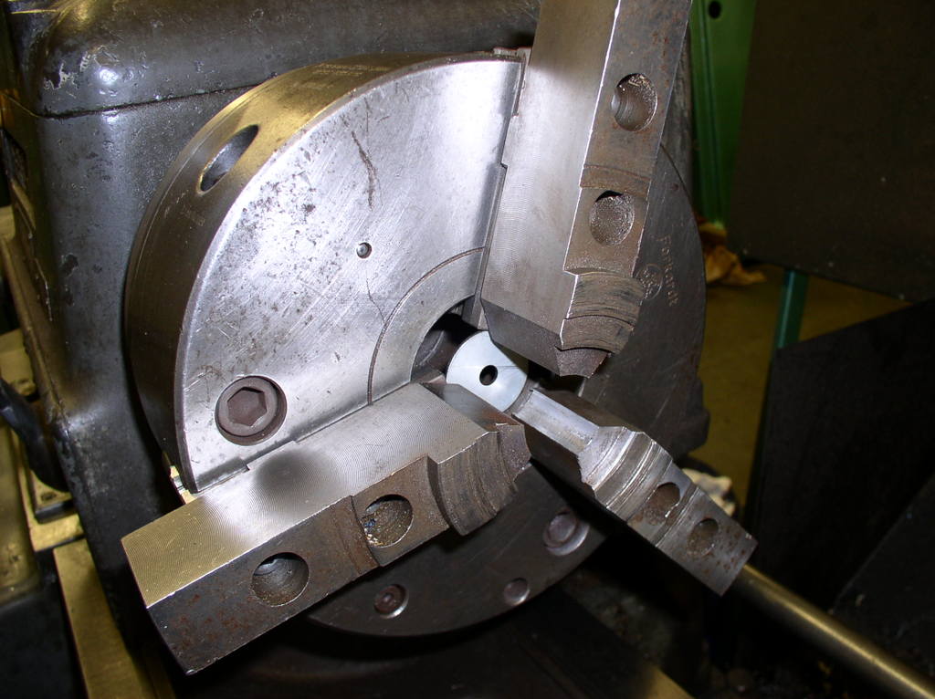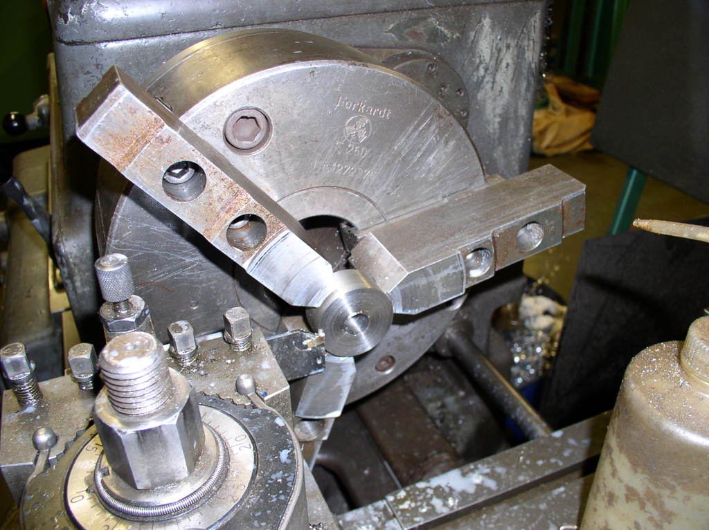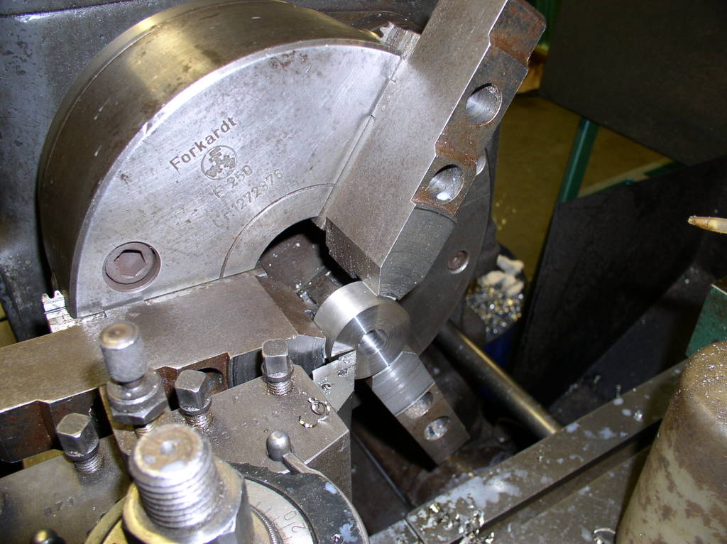 But first I have the chuck jaws to suit the ball screw,I have a number of different sizes of washers to put between the jaws to support them during turning .I turn them to the right dimension in this case 40 mm so I will not damage the part. After cutting off the exes material I make a new center whit a center drill.