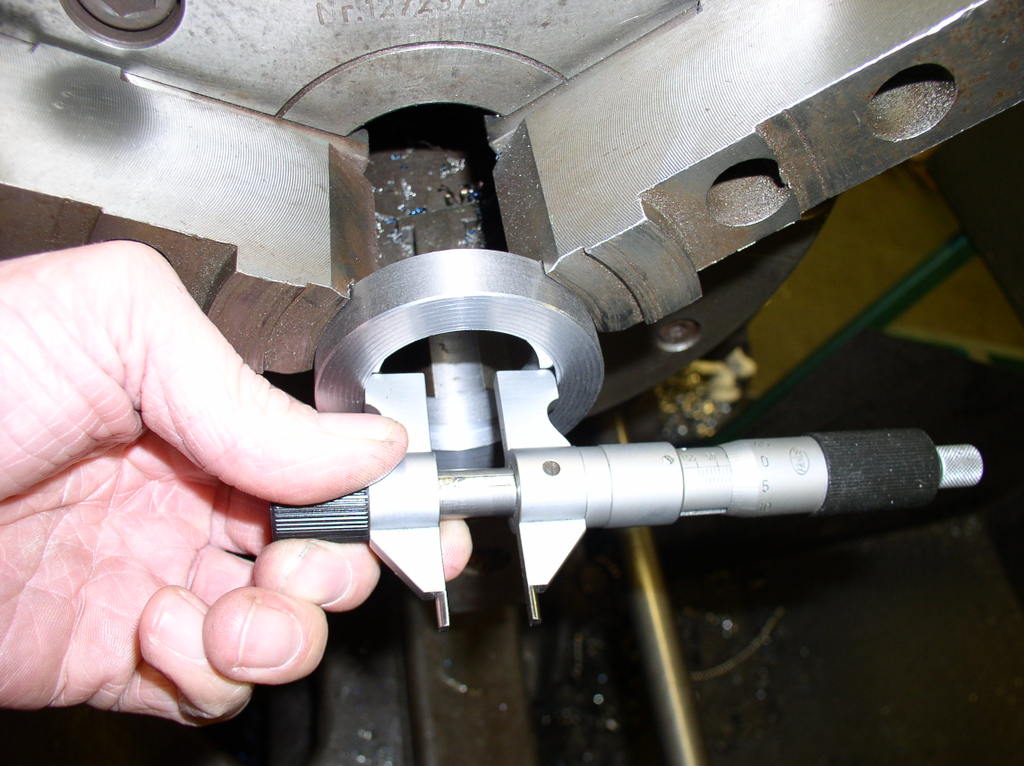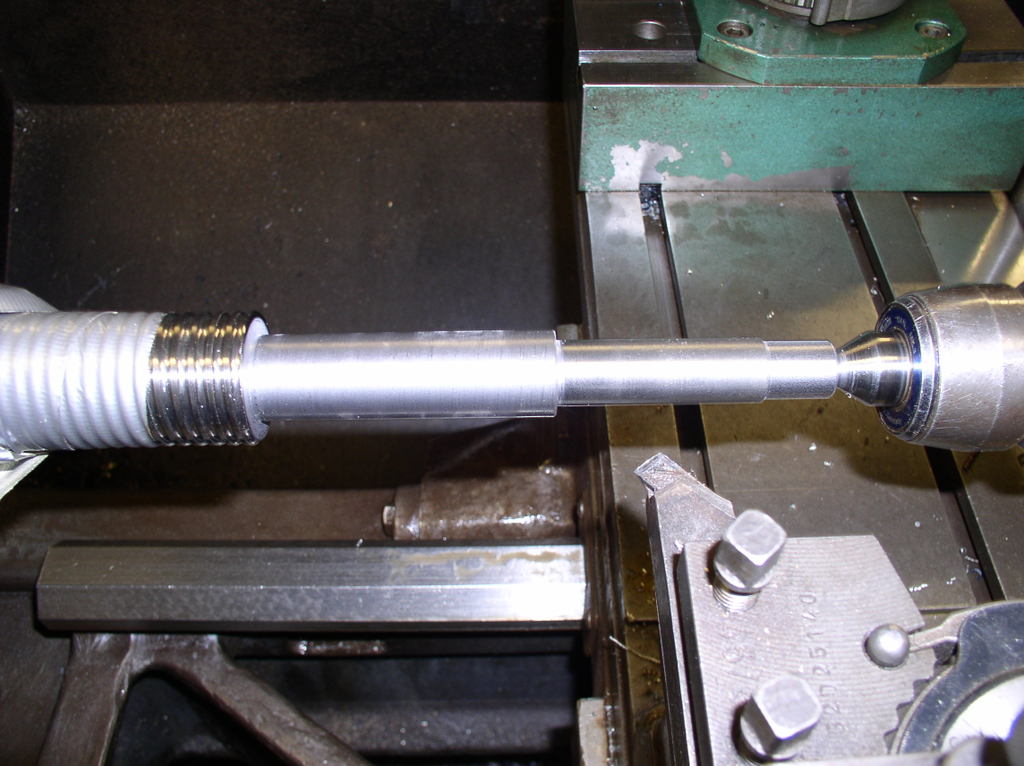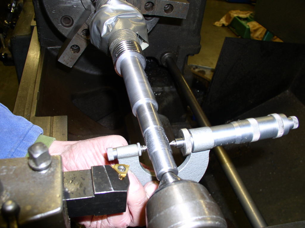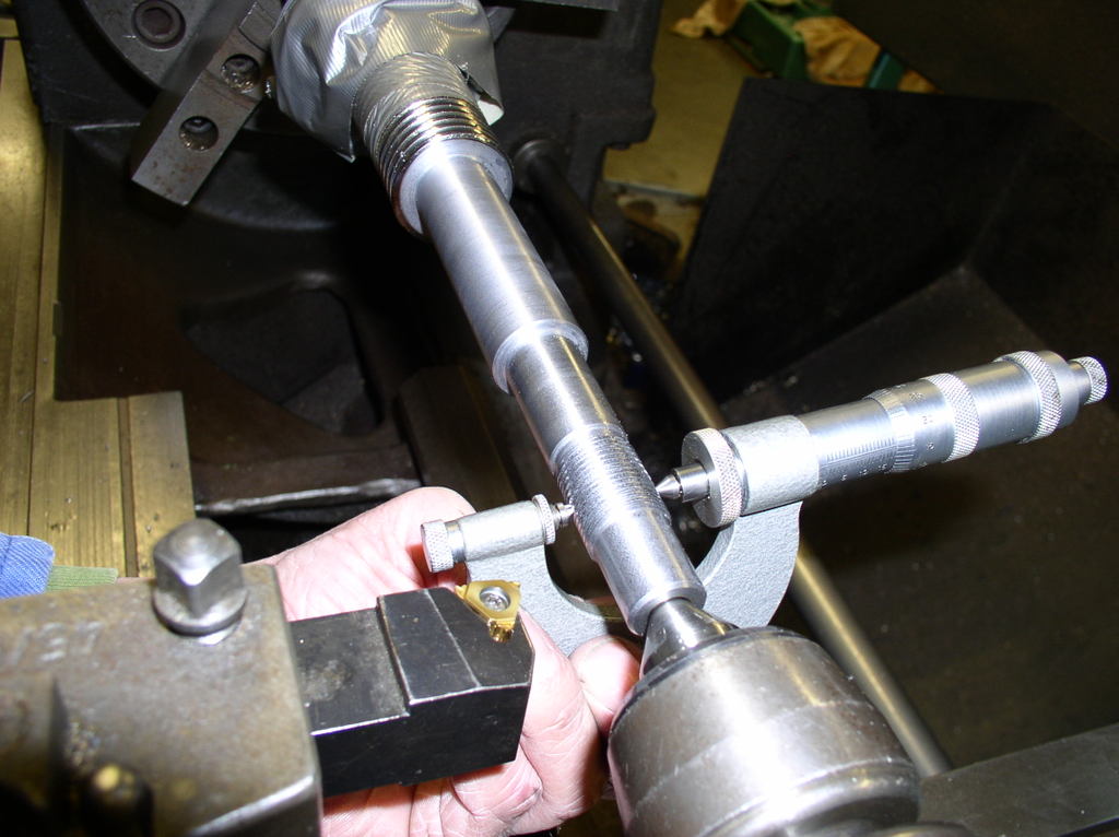 Then I removed the steady rest and the finished part and Put On Some tread for the nut and make a groove for a circlips I am using a caliper to measure the tread