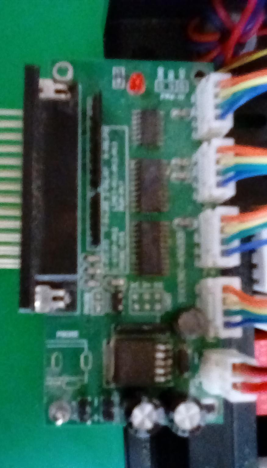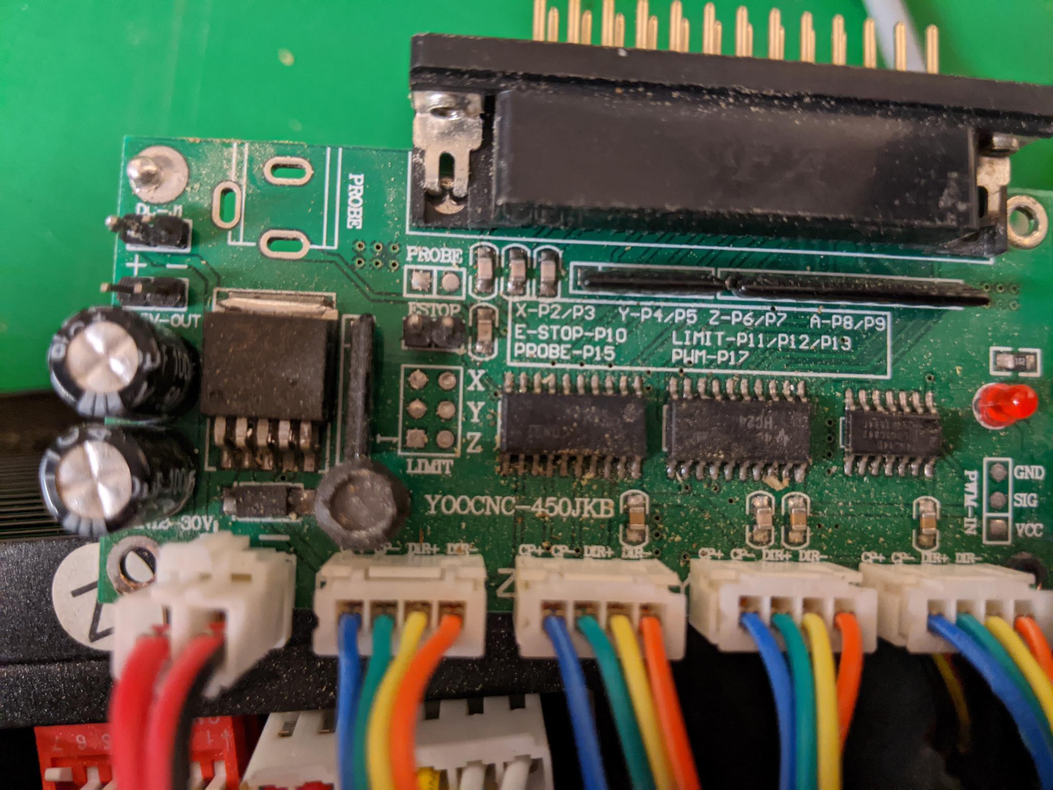 If I take my glasses off, the image swims into... less focus... okay, worth a try. But, I have to admit that the connectivity to the board appears just to be power (lower right) followed by 4-axis drivers (the four four-wire interfaces above that). And NOTHING ELSE?! The circuitry around the lower-right connector I would guess to be a local 5V logic supply for the board (hmmm, maybe... pretty heavy duty if it is), and board silkscreen printing appears to show a power jack (not fitted), some jumpers - not fitted (although there's a two-pin jumper fit, but can't read the silkscreening around that). What isn't evident are the usual 5x digital inputs - used for E-Stop/Probe/X-Limit/Y-Limit/Z-Limit (conventionally, although can be used for practically any function). Nor any suggestion of the usual opto-isolated inputs to support these.