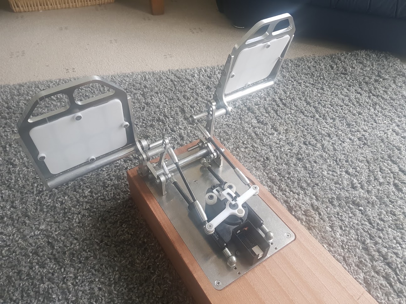 It's been a while since I last posted any updates on this project. I've practically very closely finished them and are currently in a working test position, there is still a few things such as the foot rests below the pedals and also to add the brake sensor and return to centre springs for the left/right motion. There has been some changes to the design such as printing the internal white section as I found the holes very uncomfortable while using them, also the addition of the huge wood base which is there for two purposes. It adds weight as these pedals are not bolted to a frame and also tidies the Ali base up, this still needs finishing as it's not been totally machined down. I had used springs for the brake feedback but after use I returned back to the gas struts and changed the linkages a little to add extra mechanical aid. The leo bodnar board works amazing, super simple and after numerous revisions on where and how to place the hall sensor I finally managed to get a great location which works, thank the lord!
