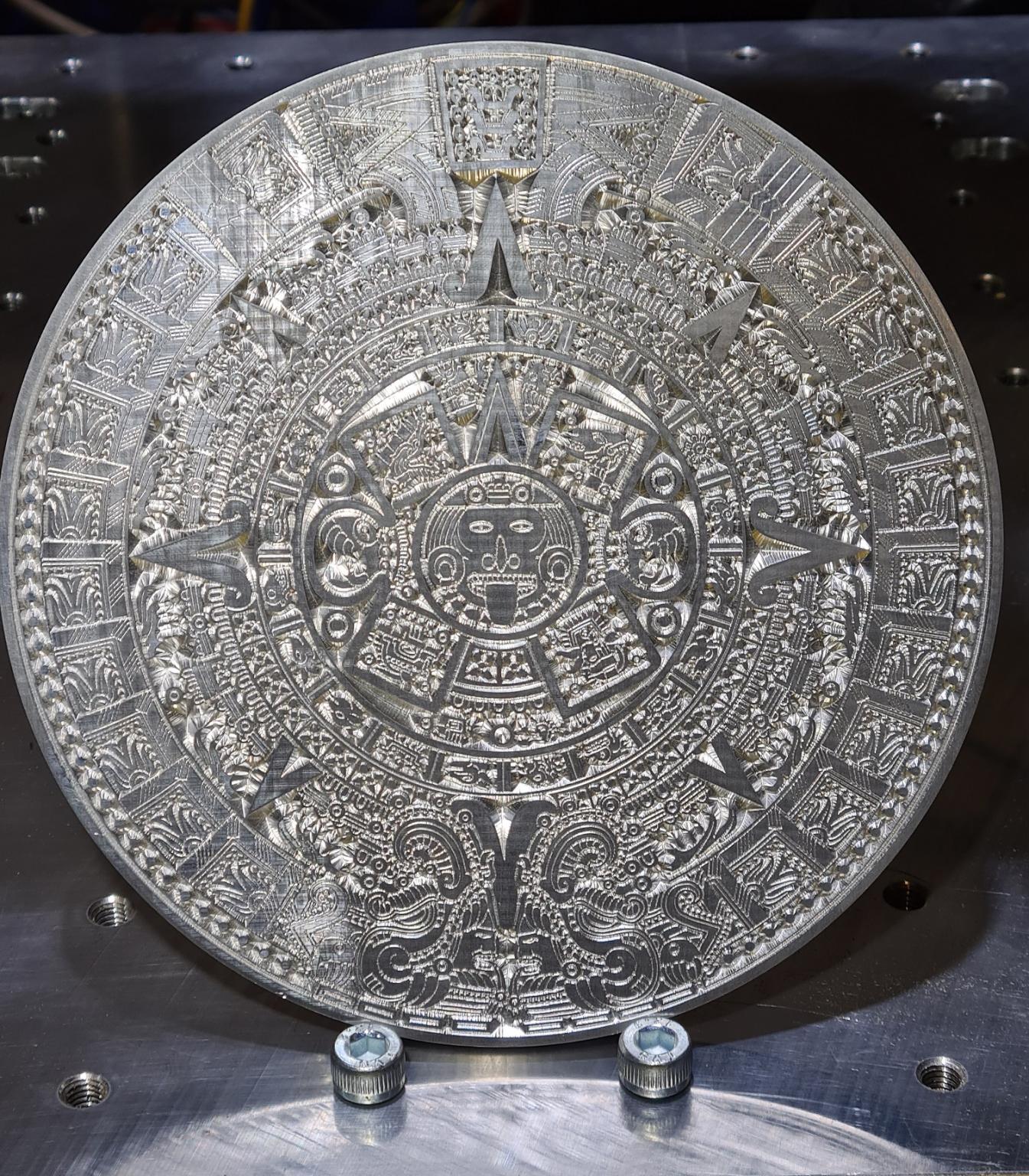 My test of every router/mill I build is to cut the Aztec calendar in 10mm Aluminum because of the very fine detail in it. Then straight after I cut it again over the top to make sure there are no errors. I do this because if there were any errors or significant deflection then the second pass would destroy the fine details cut in the first. (See the poor pic)