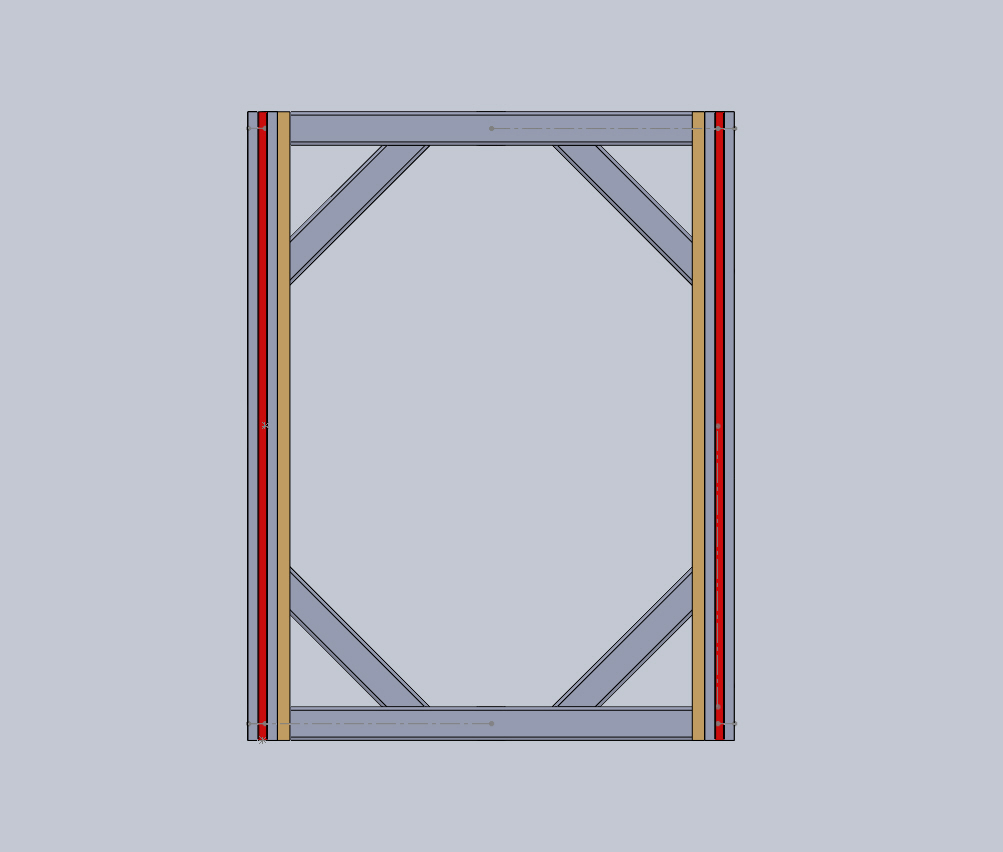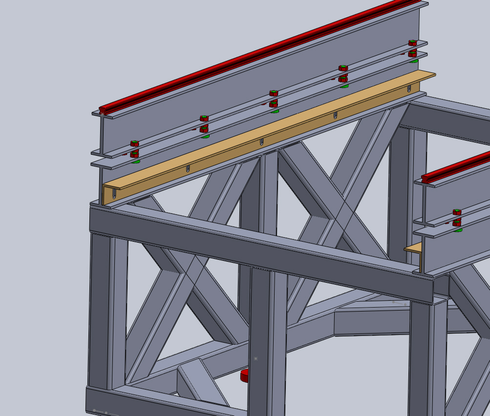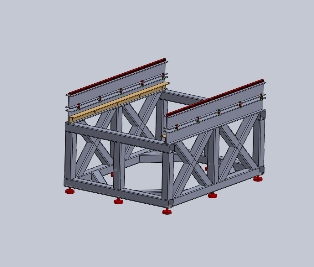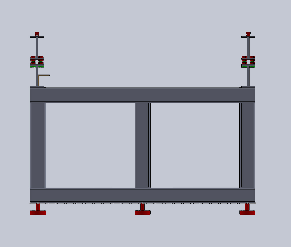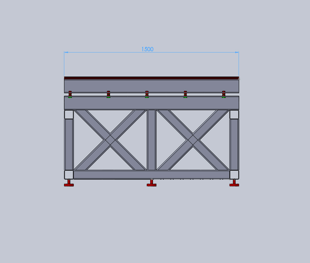 You see where you have two crosses in the side panels, I think if you had just 2 diagonals like this I/I\I it would be enough because you just need to create a triangle. For your size machine I would say the 80x80x5 might be more than you need but if you are fine with that then more is better than less. The I beams I would change for box section because I beams are not so good with twisting and you might get more sideways twist than you would with box section. Also you have not put any diagonals at the ends like you did with the sides. Good things you have included are 3 legs each side, adjustable feet, adjustable top I beam to get the top surface straight. Looking at the drawing, I can't see much adjustment on the brown angle and wonder if it's worth it other than making sure the table is the same height under the cutter across all of the table.