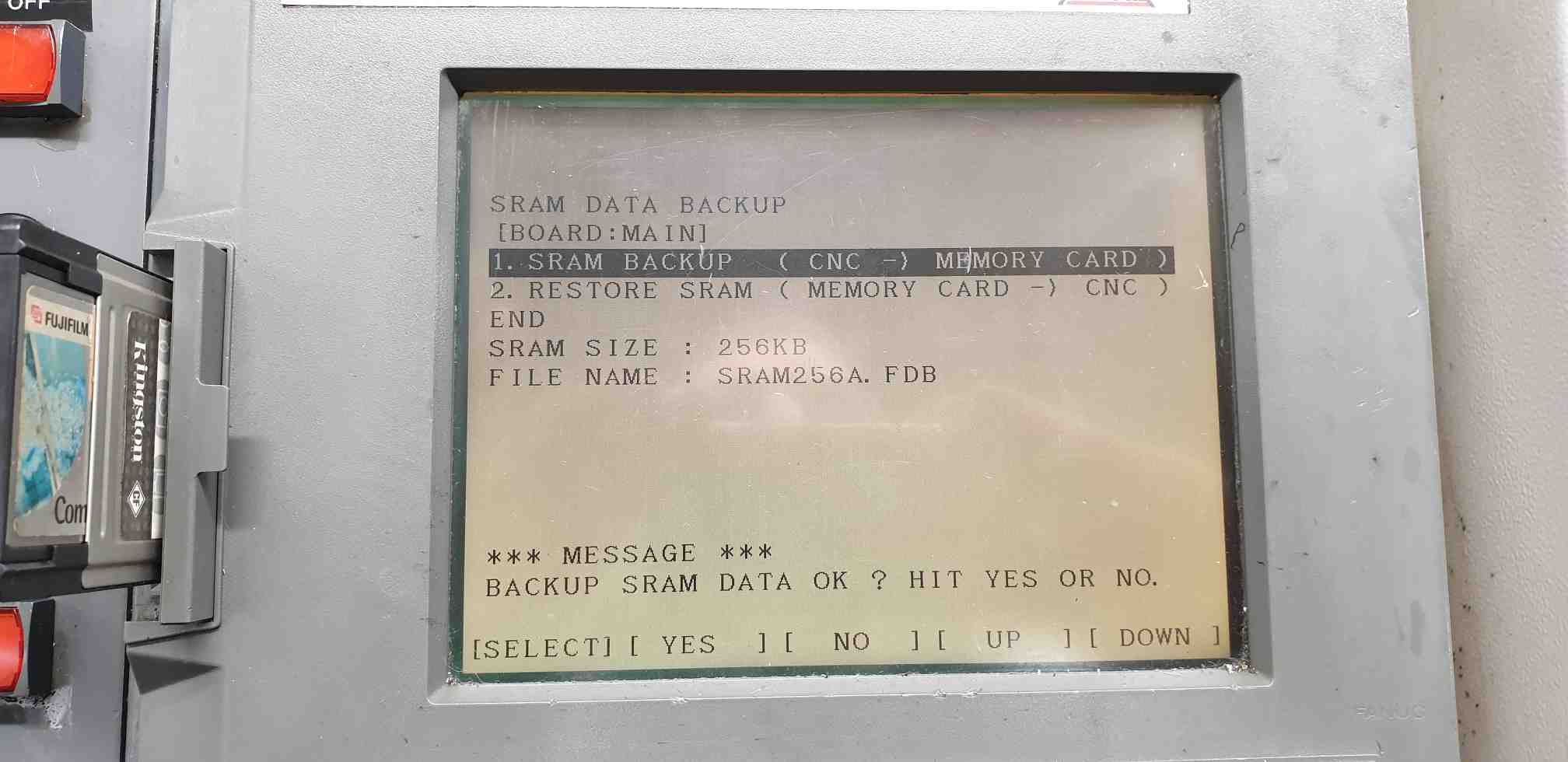 I have a Harrison Alpha 330s plus lathe with Fanuc controller and have been trying to do a sram back up as per the FANUC instructions. It all goes ok until it asks me to back up sram data.... it asks gor "Yes or no", when I hit the soft key yes nothing happens! I have tried different cards but with no luck. All these cards do however work with the machine when reading and copying program files to the machines memory. Also is the machine will not complete a format of any of these cards, it will continually just flash "formatting" and not complete! I was however able to format them successfully fat on my laptop. I'm a bit stuck now as I'd like to back the machine up but it's just not working! Any suggestions appreciated.