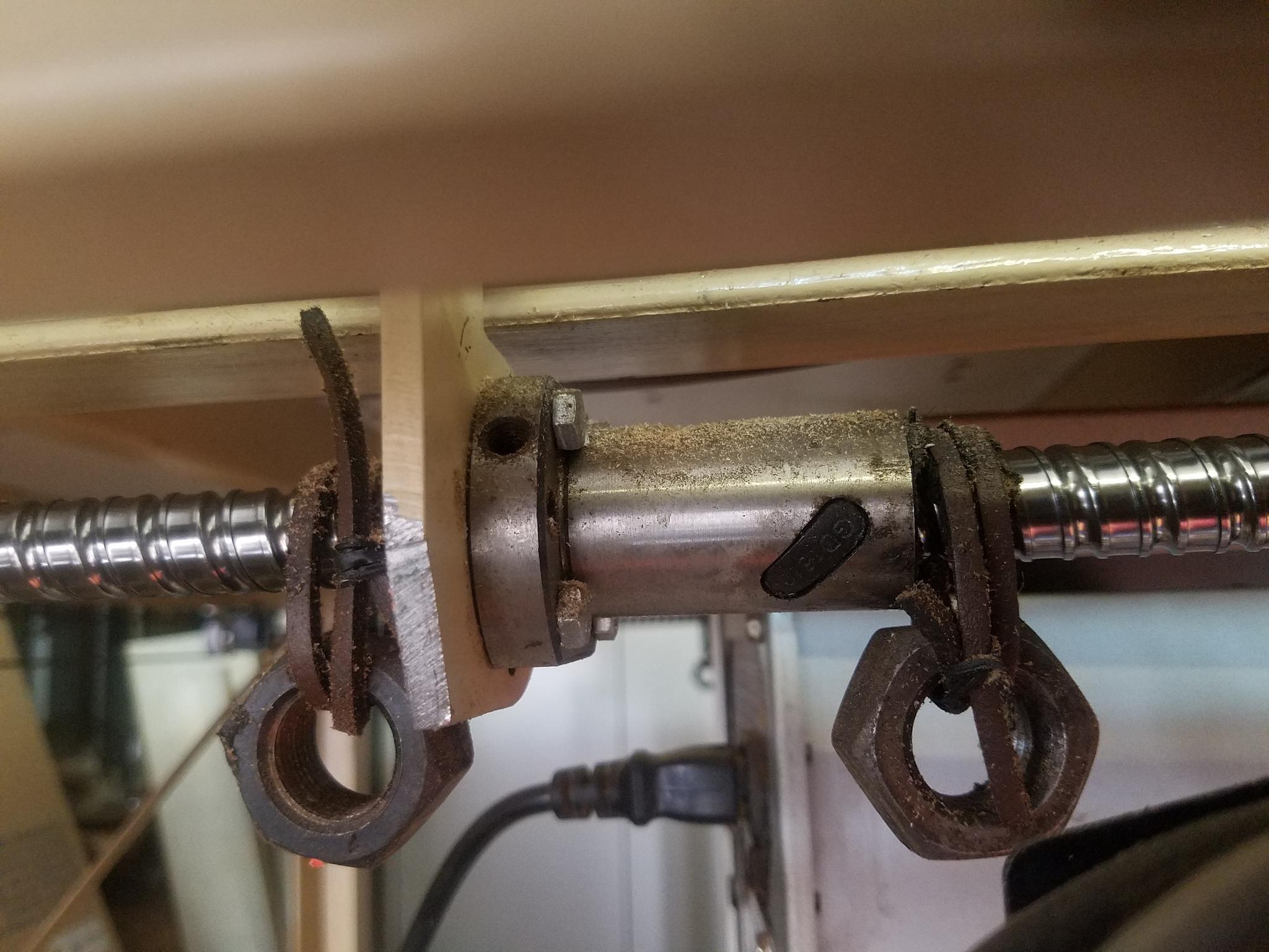 All they are is a couple of leather boot laces wrapped around the screw twice and tied off with a twist tie and given a bit of weight with a couple of 20mm nuts. I remember my Grandfather using something similar without the weights on the axles of his pushbike to keep them clean and shiny so I thought I would give the ballscrews the same treatment.