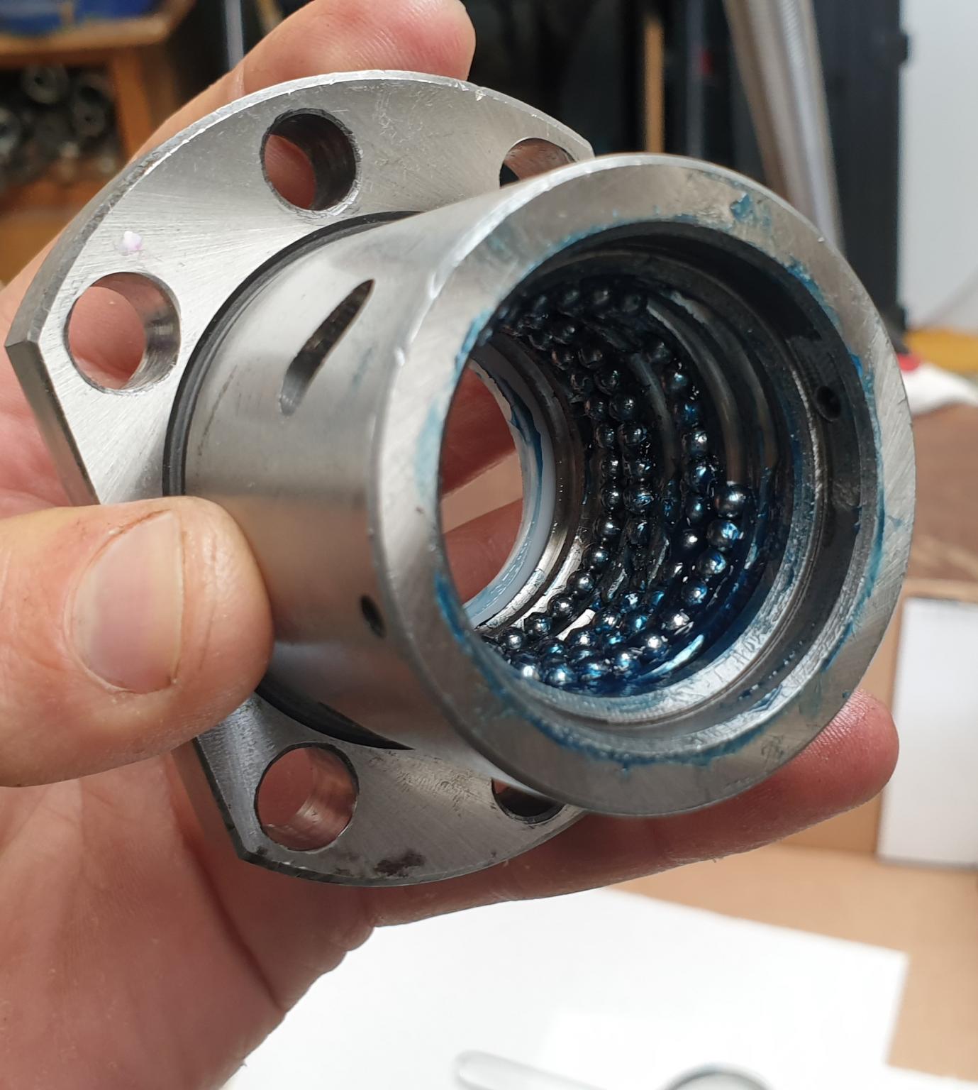 The 'quick method' posted above in the youtube vid, didn't really work for me because getting a 2.5m long ballscrew vertical and then being at the top, in a convenient place see clearly into the nuts and spoon the bbs in seemed troublesome...