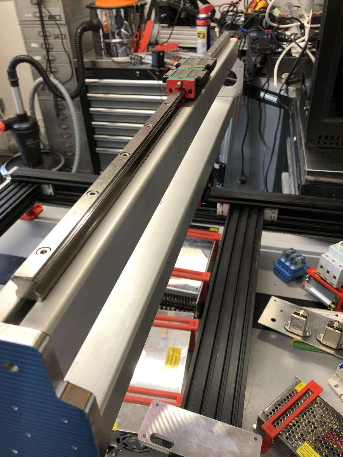 Latest stage, 'dry' assembled all the mechanics and have wired up the main electronics, they are going to be installed upside down under the bed supported by 8 anti vibration mounts. I have moved all the axis and they are all very solid (its only a 1kw kress spindle so the forces will be low compared to most of the machines on this forum), the axis are very quiet and smooth running very pleased so far. Next stage is to 3d print drag chain mounts for x axis and route all the cables and fix main drag chain under the table to link Z/X to electronics.