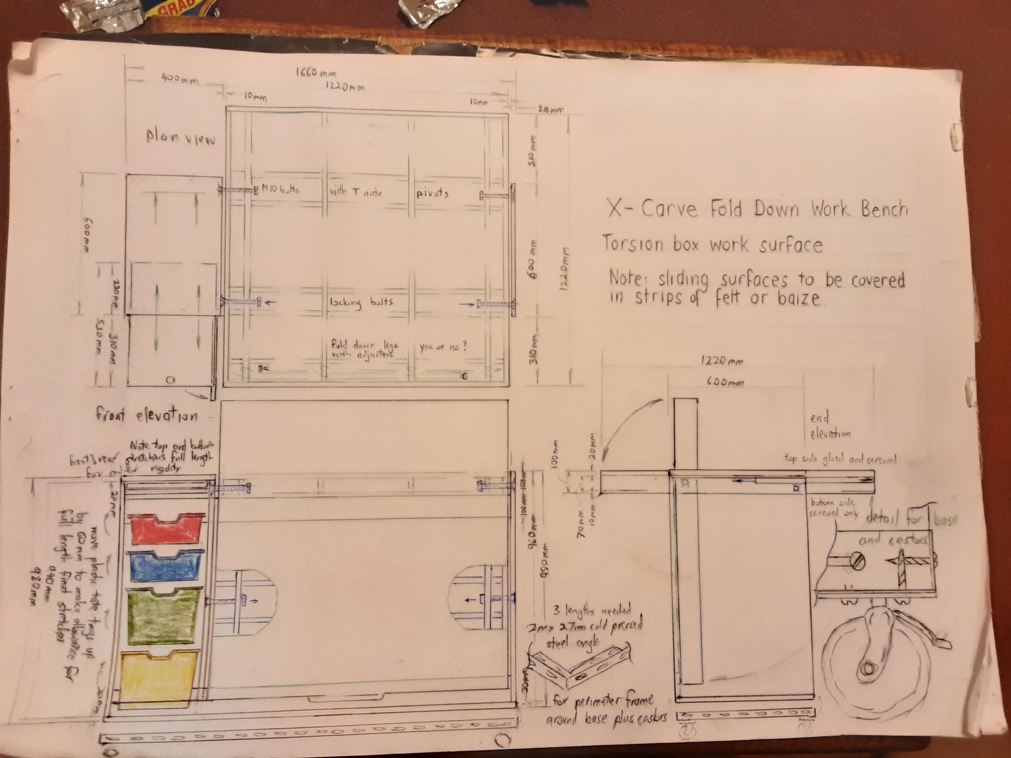 The design is a folding table as my workspace is multi purpose. Once folded down the whole unit will only be 600mm wide... Though quite long (1.6m approx) as I have included a cupboard with four plastic trays and a pull out surface for the control unit and also a laptop.