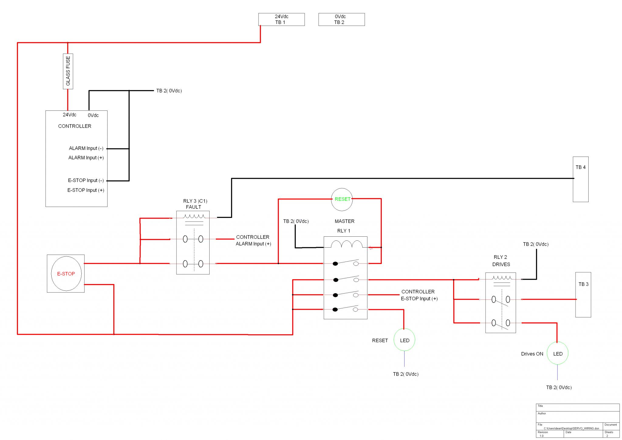 The reason for using a separate relay for turning contactors on rather than directly from the master is so that other things can be switched on like lamps to show drives are on or anything else you may like. You'll also notice I use Terminal blocks TB1, TB2, etc is to make wiring simpler rather than trying to get several wires into one terminal.