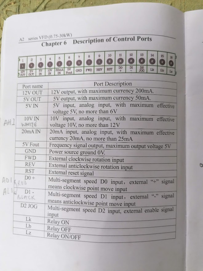 Ok, I've attached a diagram that will work. The reason your manual looks different from most others is because you have what is effectively a copy of the popular Chinese Huanyang Vfd. I have used this VFD only one time and wasn't very impressed I'm sorry to say.