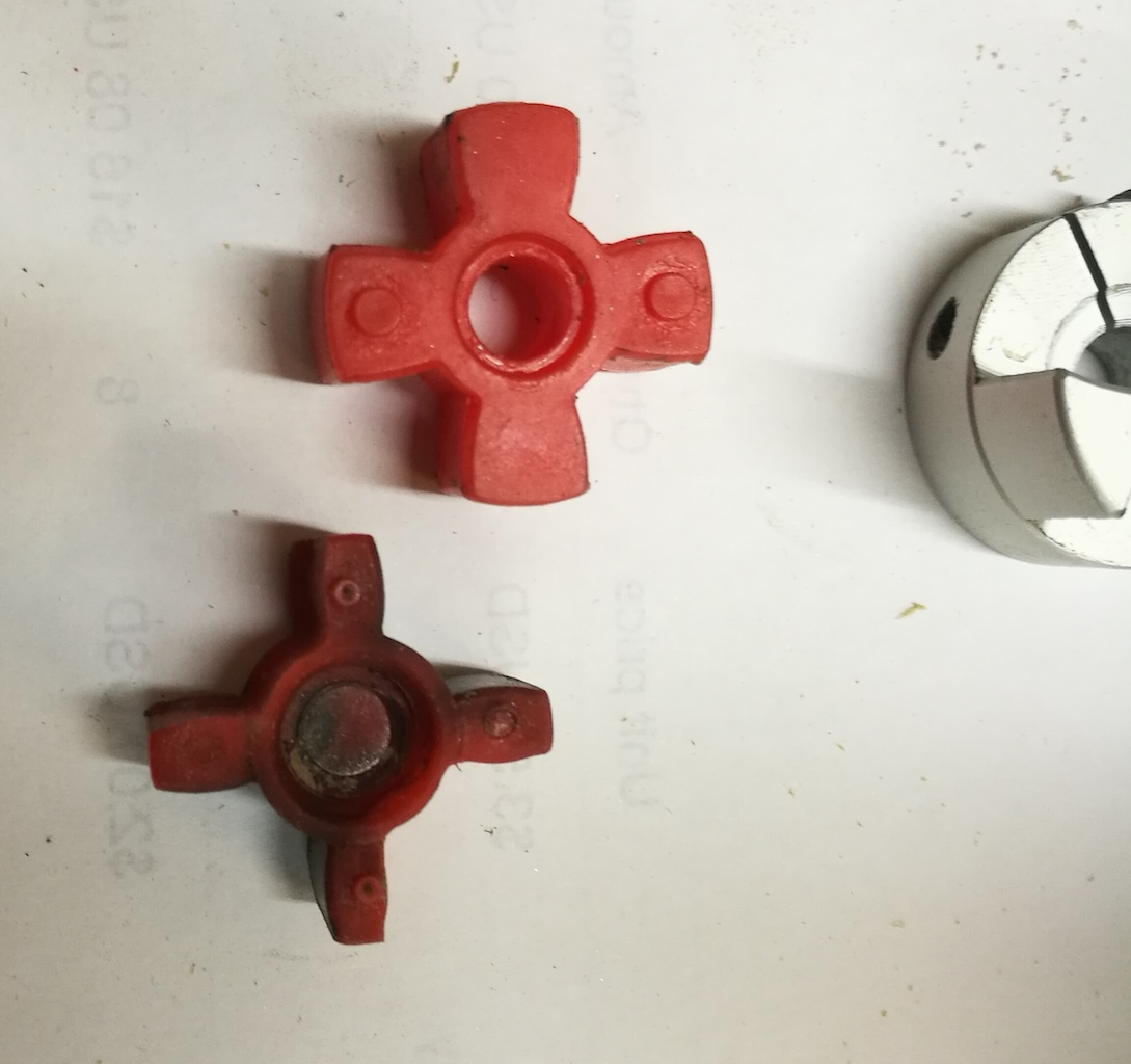 I had a moment today to look at the Z axis stepper to ballscrew connection on my DIY gantry cnc. The two shafts have been out of alignment for some time. The plastic bushing was really worn, see pick.