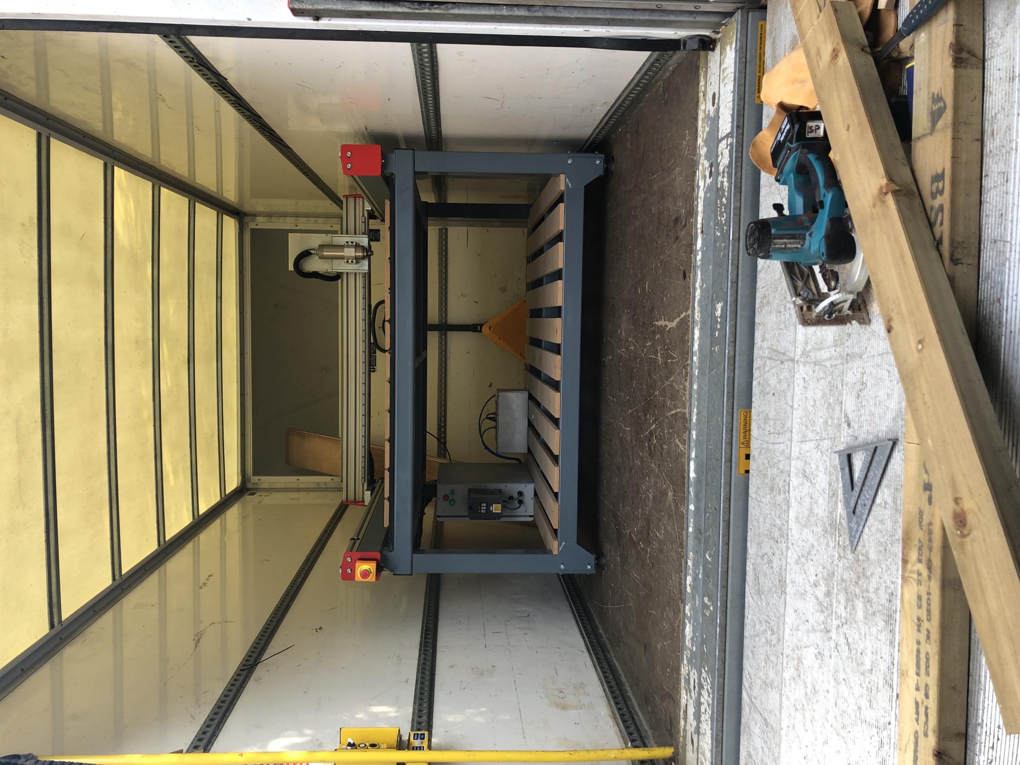 I made a tailgate extension out of some 18mm ply and picked up the CNC with my pump truck and lowered it onto the tail lift. How ever i soon realized the tail lift could not take the weight so i eased it back inside the van and rang my son