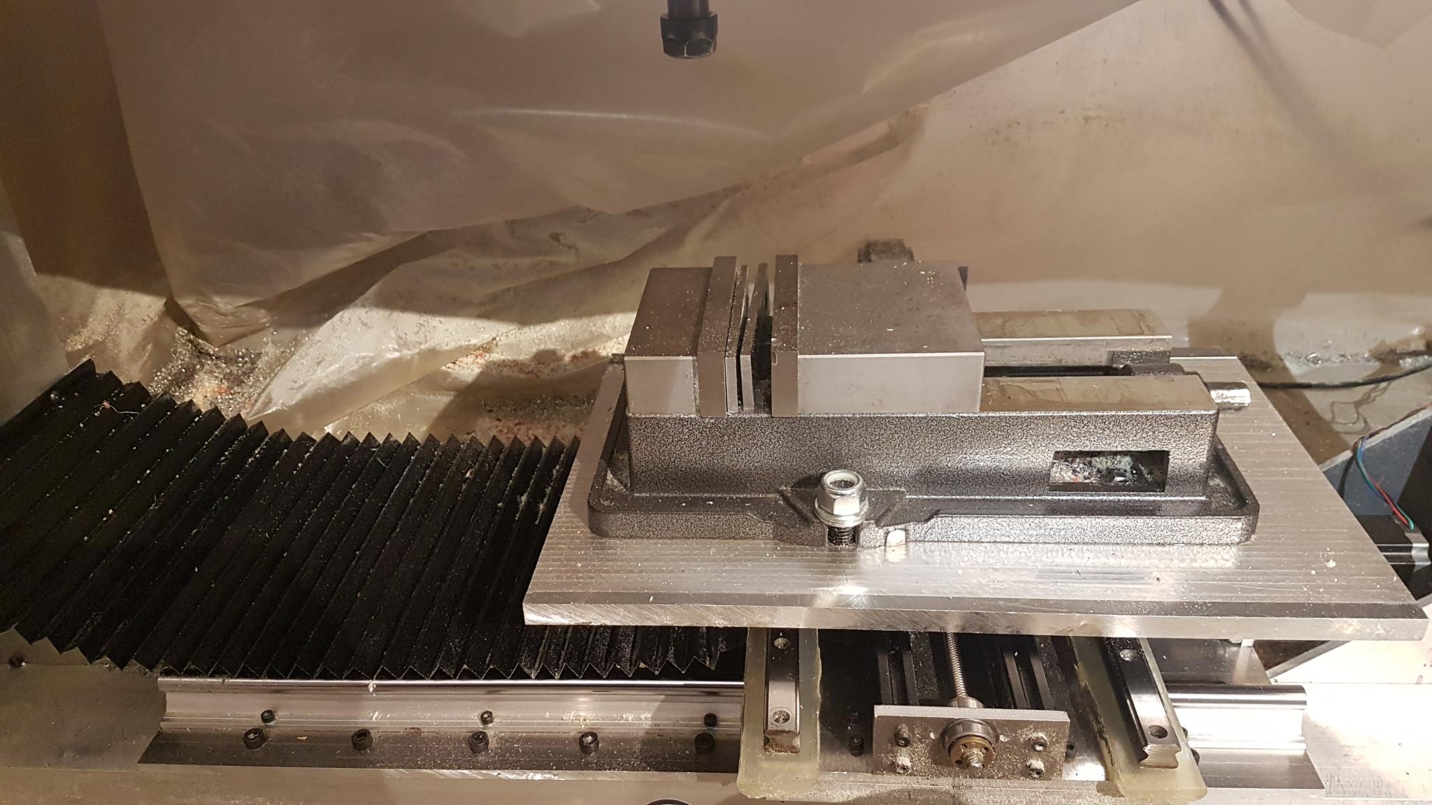While it's technically my second go at making a CNC router/mill thing, the first attempt used regular threaded rod for linear motion and only ever managed to draw a wobbly circle with a pen. As I still didn't know very much, and had a pretty tight budget when I began designing this one about 3 years ago, the design evolved quite a lot, depending on what parts were cheap and available. It runs using three 1.89 Nm steppers, which gives me pretty slow rapids, but otherwise seem to provide more than adequate torque for cutting. Inside the boxy and probably overbuilt Z axis is a standard Chinese 2.2kw water-cooled spindle, which seems to cope with machining Aluminium and a little mild steel pretty well, but is really lacking torque at low speeds with endmill sizes 10mm+.
