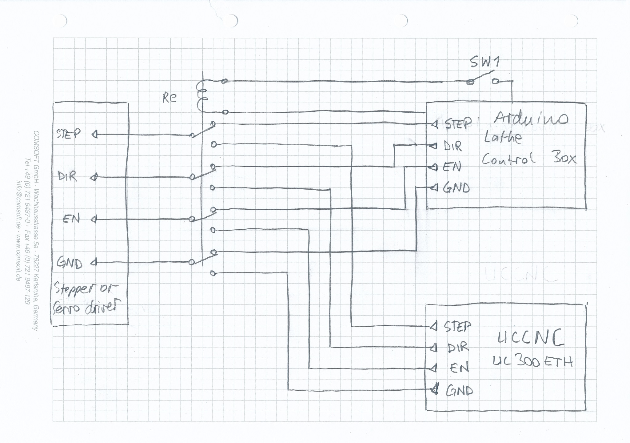 I am sorry but I have no diagram. Anyway, it is a simple circuit with one switch and a relay which flips the step, dir, en and gnd signals, all four at the flip of the switch. The circuit is really simple.