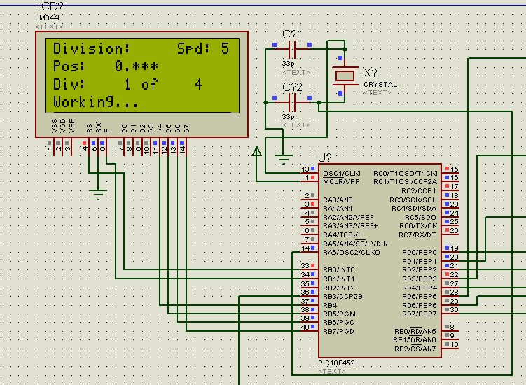 I'm unsure about how the proteus simulator works - however I should point out the movement is performed using interrupts - these are pretty rapid too (up to 10,000 per second). I'd guess that the simulator either can't handle interrupts or can't handle them at that speed.