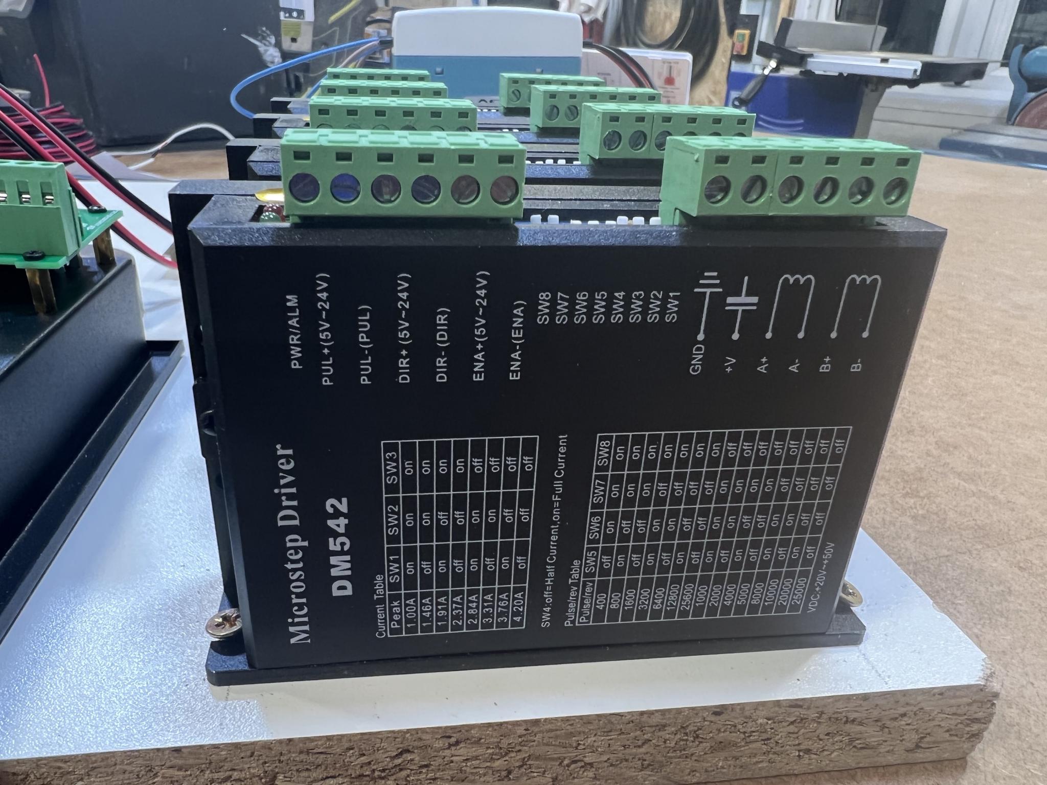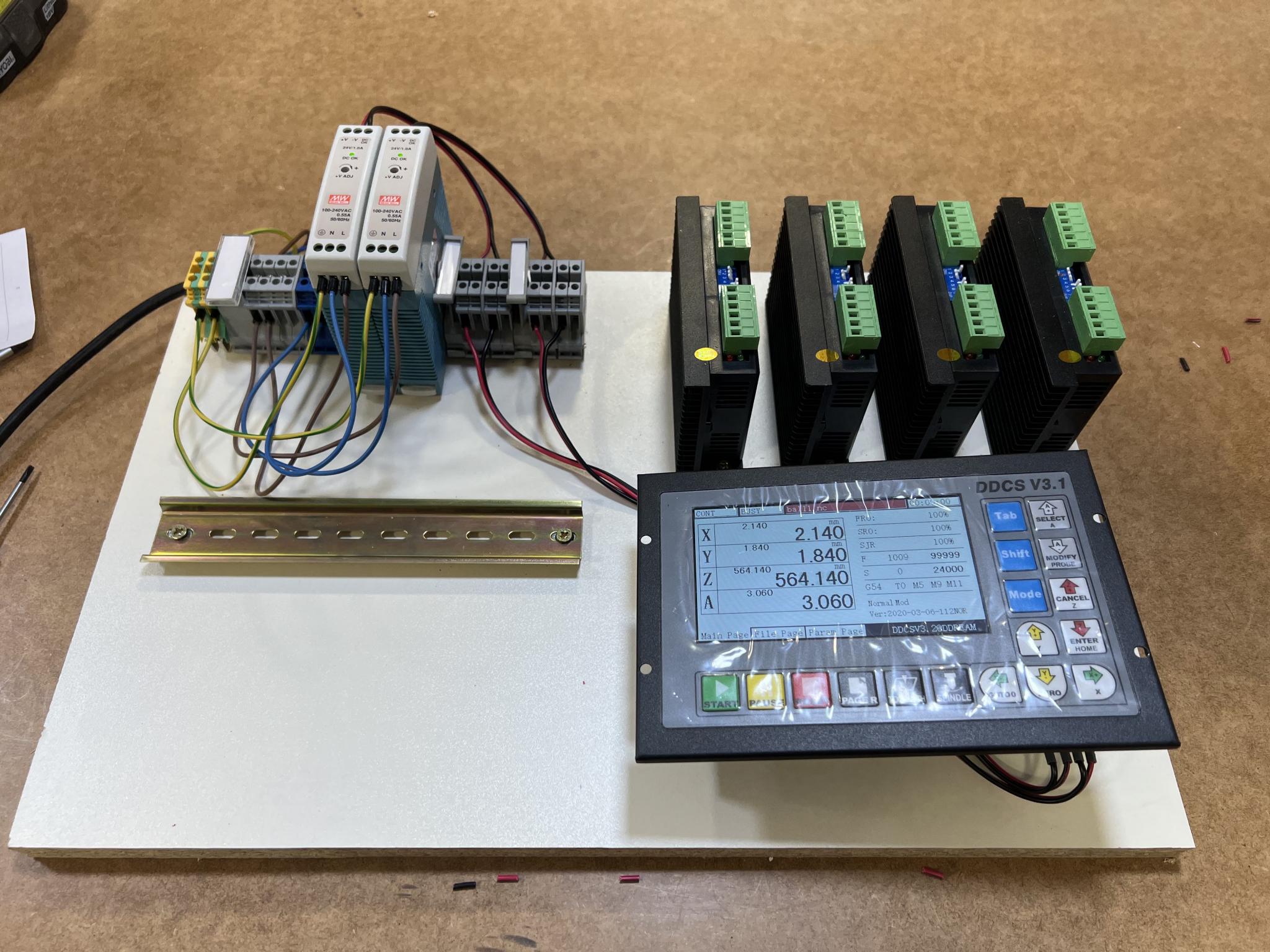 I've also purchased four new stepper drivers, 2 * 24v DC power supplies and some DIN terminal blocks. My plan is to to build the new CNC controller electronics just mounted on a sheet of wood for now, until I get a better idea of the wiring and size of cabinet I need.