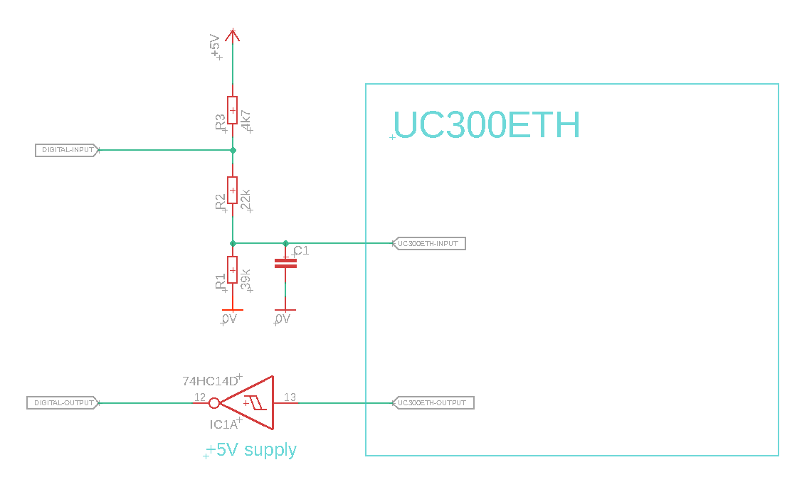 I am not sure this is right. The UC300 uses 5V logic, not 3.3V. Pin 14 of the HC14 is directly connected to pin 26 of the IDC connector #5 where the 5V output is (I just measured). Why would there be such weird voltage divider on the input? Also, the manual clearly says: "All output pins are TTL level with 0/5Volts output Voltage levels and an absolute maximum of +-20mAmps current per output channel. All inputs are TTL compatible and accept 0/5Volts Voltage levels."