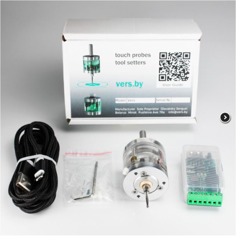 Wireless touch probe VersWLR is designed to determine the exact coordinates of objects mounted on a CNC milling machine. The CNC system generates these coordinates when the VersWLR stylus touches the object and uses them to link the processing program to the workpiece location, to measure lengths, diameters, to search for hole centers, etc. The device can be used with various CNC systems: LinuxCNC, Mach3, embedded systems on industrial machines, etc. The device communicates by air at a frequency of 2.4 GHz with a receiver and then by wire with a CNC system. The transmitter is built into the probe. The receiver is supplied as a separate pcb.