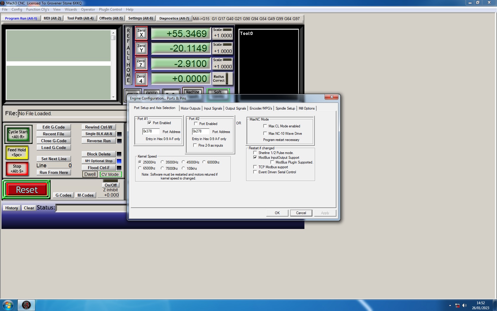 As luck would have it, my Windows XP PC blew up. I managed to source a Windows 7 PC with a parallel port, install mach3 and transfer over my config XML and license from an old backup. Doing this seems to have transferred over the pin settings etc, but I can't get any movement out of the motors. The DRO is changing like the machine is moving when I use the arrow keys, but the motors aren't working and the spindle won't start up with the usual command either.