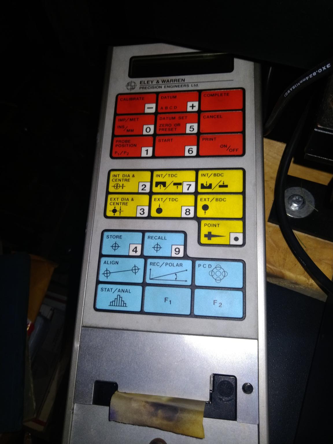 So, I can't power the controller up, or even attempt to power it up. Eley hasn't been responsive yet to my emails. Can anyone point me to an independent UK calibration lab or other resource that might be enough familiar with this class of height gauges to help me? (I'm not asking for help for free.) A pinout of the 15-pin D-sub RS-232 connector would be cool. I guess that +5v or +12v positive and negative currents would do the trick, but I'm not an electronics guy. So far I have, effectively, a potential air-bearing height transfer gauge. What would be really cool would be to buy a power box and a user or technical manual. I think this machine was built around 1988. Ask me any questions that seem pertinent.