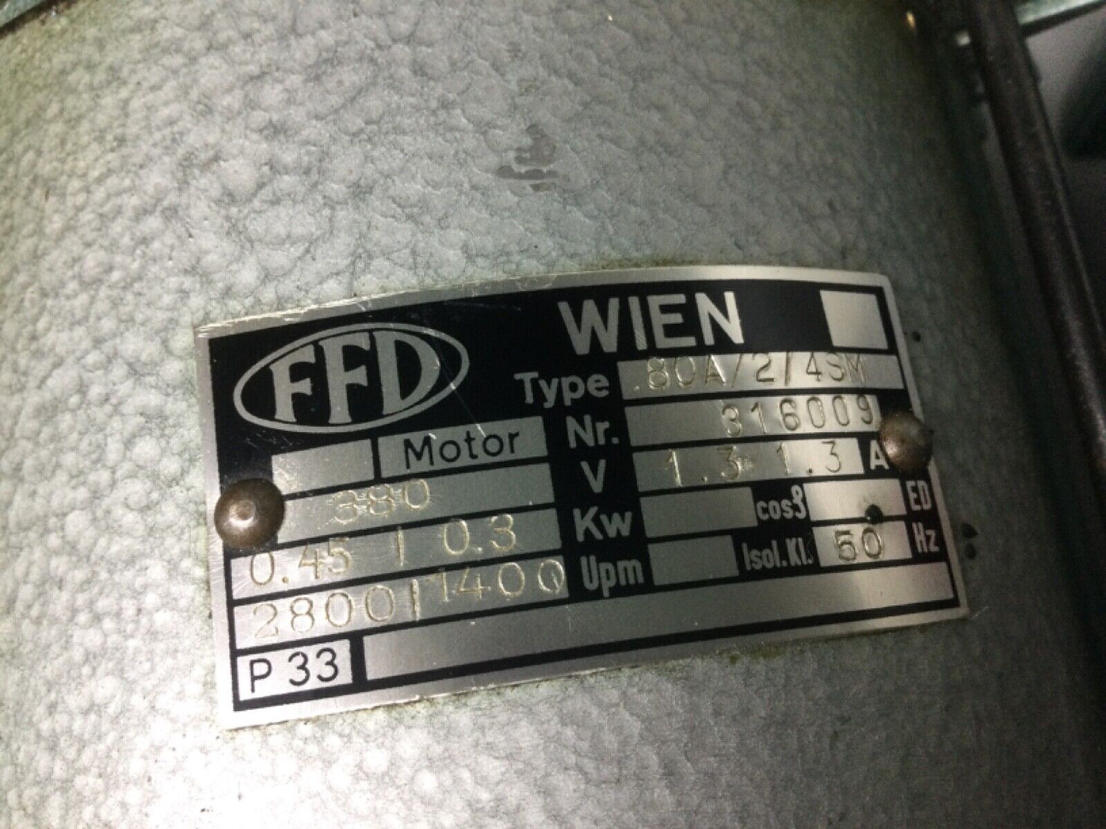 The rating plate says it's 0.45kW 2-pole (2800 rpm) and 0.3kW 4-pole (1400 rpm) so a VFD rated at 750W (0.75kW) should be fine.