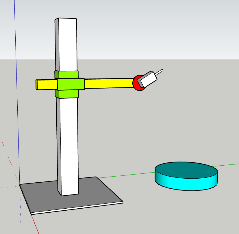 I've drawn up this simplistic sketch as a bit of a starting point. Green bit goes up and down, yellow bit left and right and the red bit turns to tip the spindle up and down. And there's a turntable...