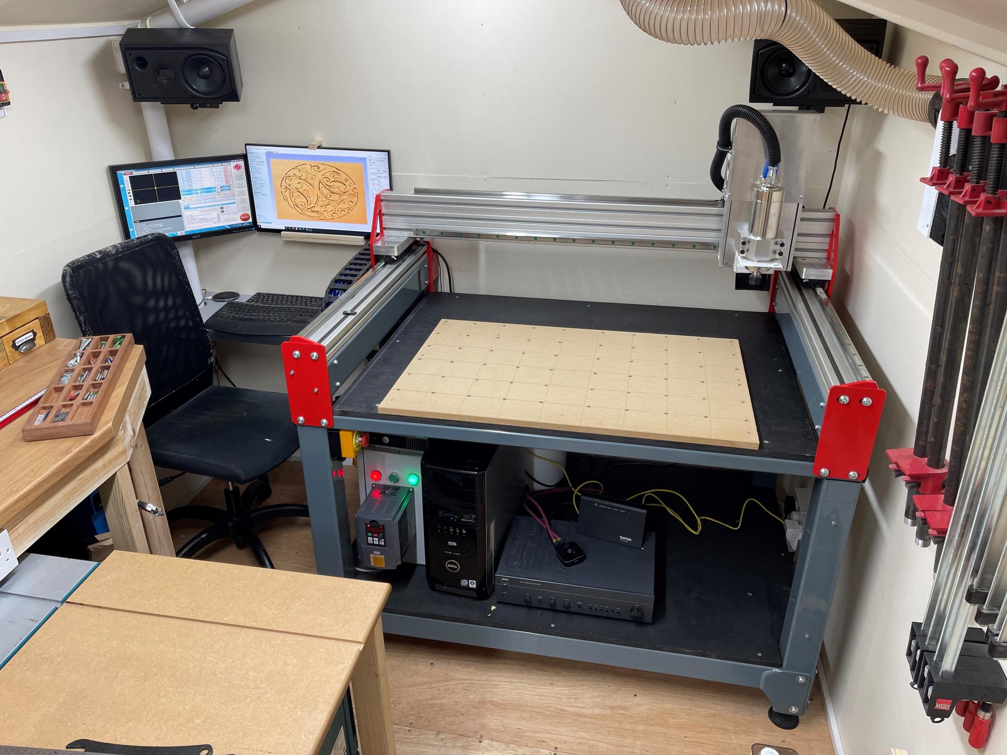 But some first impressions. Heavy. Very bloody heavy. Sure Dean may correct me, but my guess is 400kg. All parts are heavy duty, either thick steel box section for the frame or milled aluminium....guessing over 1/2” thick. Totally rigid which is key to accuracy and decent cuts. Ploughs through the wood I’ve presented it with and I bet I’m cutting conservatively. Can cut aluminium as shown by Dean’s test piece he gave me. I’ll save aluminium for a later date. Electrics wise, I know little about, except to say the electric enclosure is neat, tidy and well laid out. Certainly not a worm’s wedding!