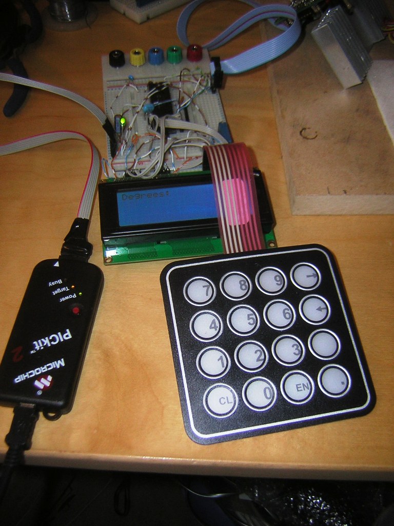 Well the machining of the stepper mount has taken a back seat for a while due to the weather - it being too cold to work out in the garage (and I've had a cold too). So I decided to buy a PIC programmer with the original intention of using Kwackers software and a 16F452 PIC but then I decided I wanted the stepper driver to be built in, not a seperate board and, hey ho, I like writing code. So I knocked up a quick breadboard using a 16F877 I had lying around and wrote a fledgling set of routines to read the keyboard, drive the display, create stepper pulses, etc. At the moment this is driving my L297/298 stepper board, but I have some IRF520 logic level MOSFETS and I plan to drive the stepper directly in Unipolar mode with a chopper current limiter. I have a ex-laptop 24v 65W (2A+) power supply that is perfect for the job. The PIC and display take less than 60mA so a straight 7805 regulator on a small heatsink will provide the 5v rail.