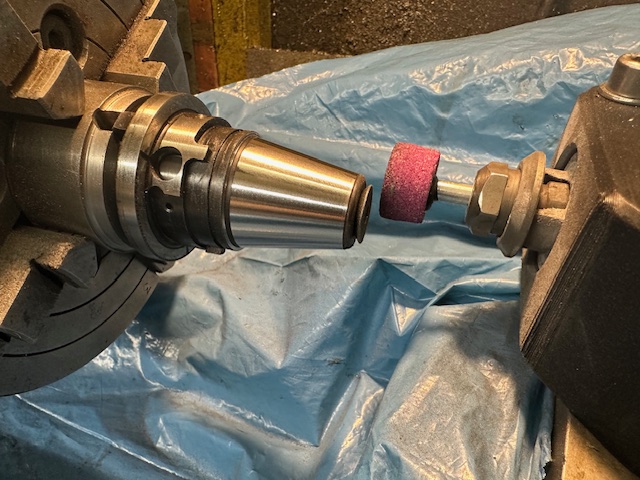 By this point, I’d poured too much time into this project to chuck it in. So, my options? Shell out a few hundred pounds for a new master chuck body or try to salvage the dodgy one. Problem is, the body’s hardened to 55-58 RC, so turning it was out. Time for some workshop bodgery. I 3D-printed a mount for my Metabo die grinder, turned a mandrel on the lathe, and draped my trusty S&B Model A in as much protective cover as I could. Then, I set to cylindrical grinding the outer taper of the master chuck, this time true to the bore. The finish came out surprisingly decent, but I’m not keen on making a habit of it—my lathe didn’t sign up for this!