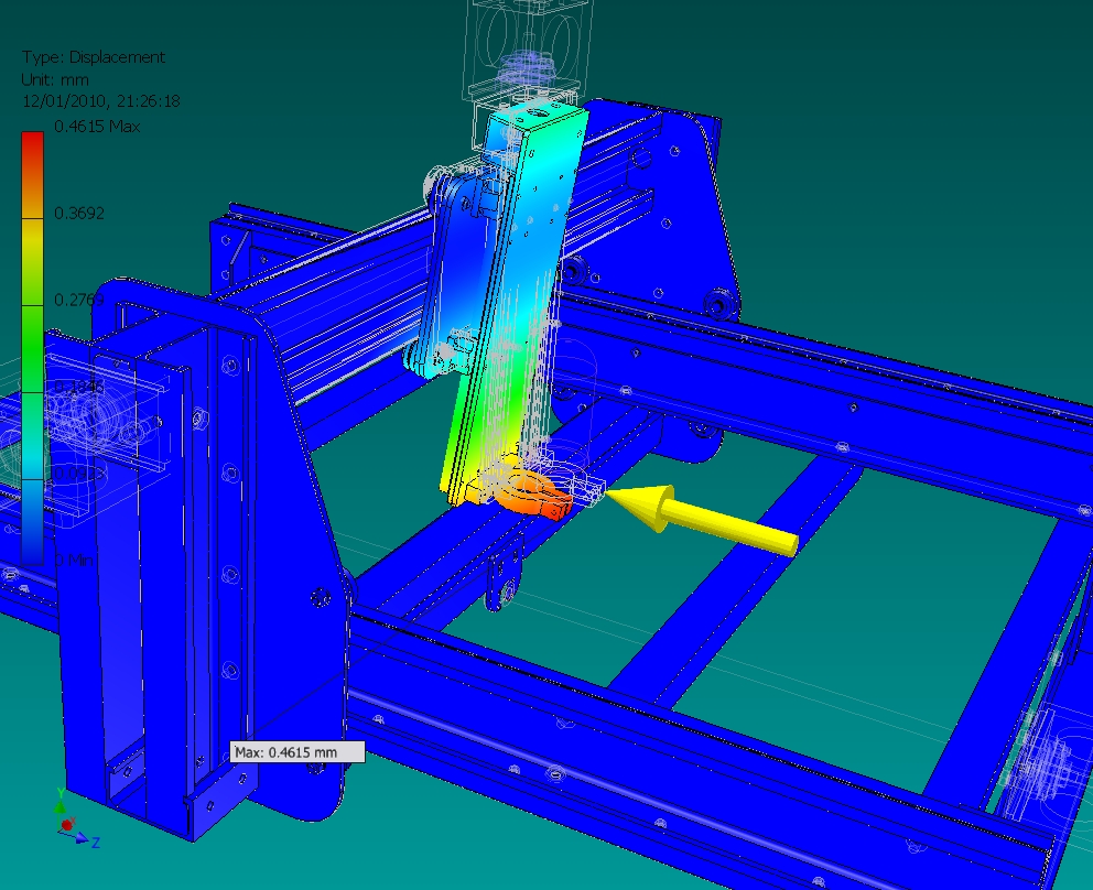 I didnt have much spare time last night but quickly ran a test applying a force of 500N in the Y axis direction at the tip of the router with it at its lowest point produced a deflection of about 2.5mm !! much more than I remember although I have changed things a bit since the last run, I think that the channels on the side of the machine will be ok, but I need to change the X axis channel to something more substantial, I think that the 500N force is possibly over the top it is a stab in the dark !!