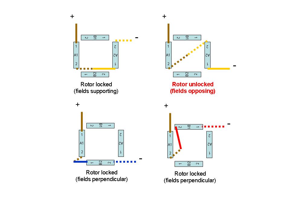 2. Pick another one lets say Orange. wire it Brown to supply +, brown/white to Orange, orange/white to supply minus. This puts two winding in series. Turn on the power, make sure the current is OK (~1A). Is the rotor locked? If it isnt then this second winding is A2 and is reverse wound to A1 (i.e Orange is A2-2, Ornage/White is A2-1). verify this by reversing A2 and checking the rotor locks. Repeat with remaining 2 coils to verify same behaviour (B1, B2)