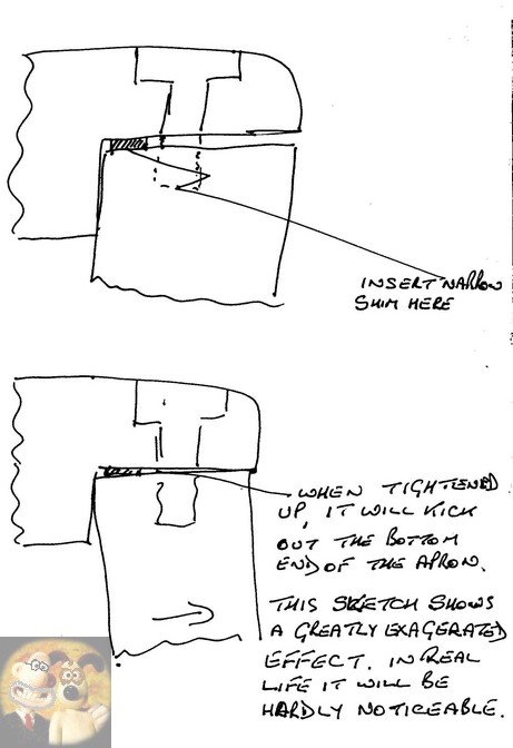 What John was suggesting was shimming the vertical split between the outer and inner parts of the apron (see arrow in pic). this would have the effect of moving the gear out away from the bed.