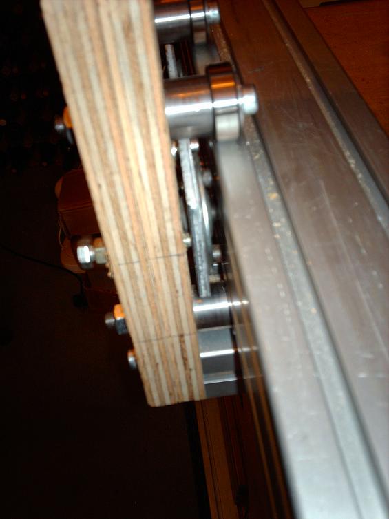 If you mean translating sideways, then none at all. What I've tried to photograph (but it's not eay to see) if that there are a pair of roller balls in plates on the side of the gantry legs, which run against the side wall of the aluminium extrusion. These are the types used to support big sheets of wood or steel and provide a friction free rolling surface, or they are used to push cargo boxes onto planes. On one side they are fixed rigidly to the leg, and one the other side they are pre-loaded by means of two bolts so that the base frame is hugged by the legs. Does this make sense?