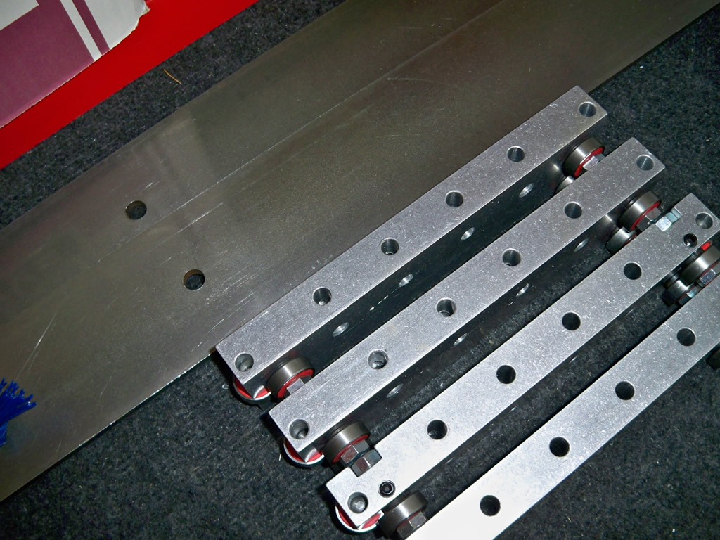 I also have 2 lengths of new 3" bright bar pre-drilled at 300mm c/c in which these bearings mount perfectly with no play and smooth operation. Bright bar if you dont already know is a drawn steel which is harder and more precise than normal mild steel. This material is the ideal solution to work with these bearings. The bearings can also be used on mild steel 6mm flat bar also as these are some adjustable grub screws on the underside of each carriage to move the lower bearings up and down.