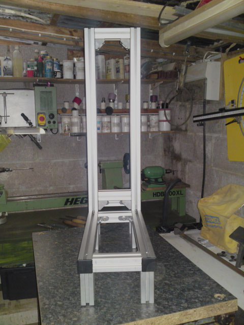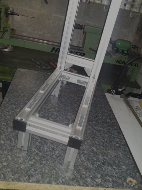 'Y' ?? it's the Z that will be the most worrying, The design as pictured in the .pdf uses 40X80 extrusion I am using 45X45 but where the original has a 45deg brace using a section of extrusion, I am going to use triangular aluminium plates (something like 300 X 500 X I cannot remember my geometry for the longest side). I am thinking of using the space within the two plates for something, just not sure what!! The motor for the Y axis is mounted to the rear of the machine.
