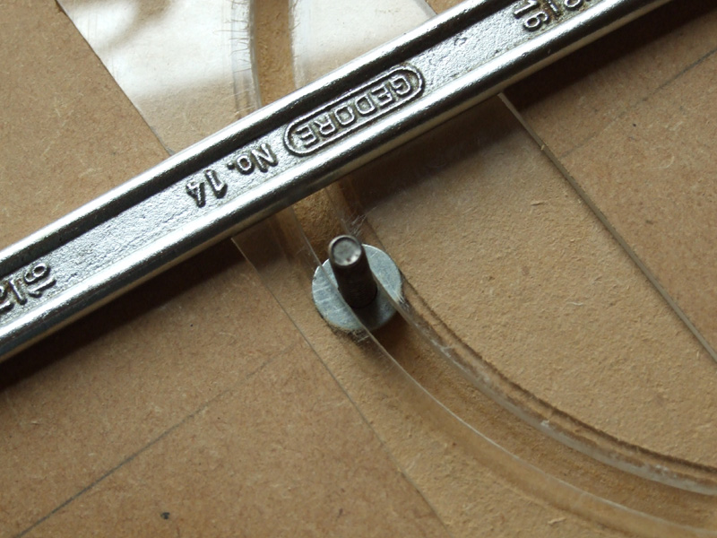 This spanner is pemanently located under my router table in a manner it will be withdrawn from the collet nut and fed onto the nut when needed but I need to cut/drill a cutout in the shaft for it to go on the arc slide here.....