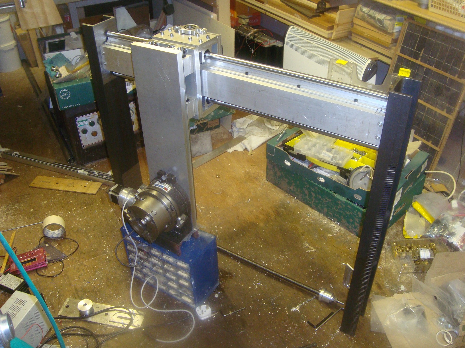 Some progress today. I made another of the above part and assembled the 50kg(!) gantry, then assembled it:
