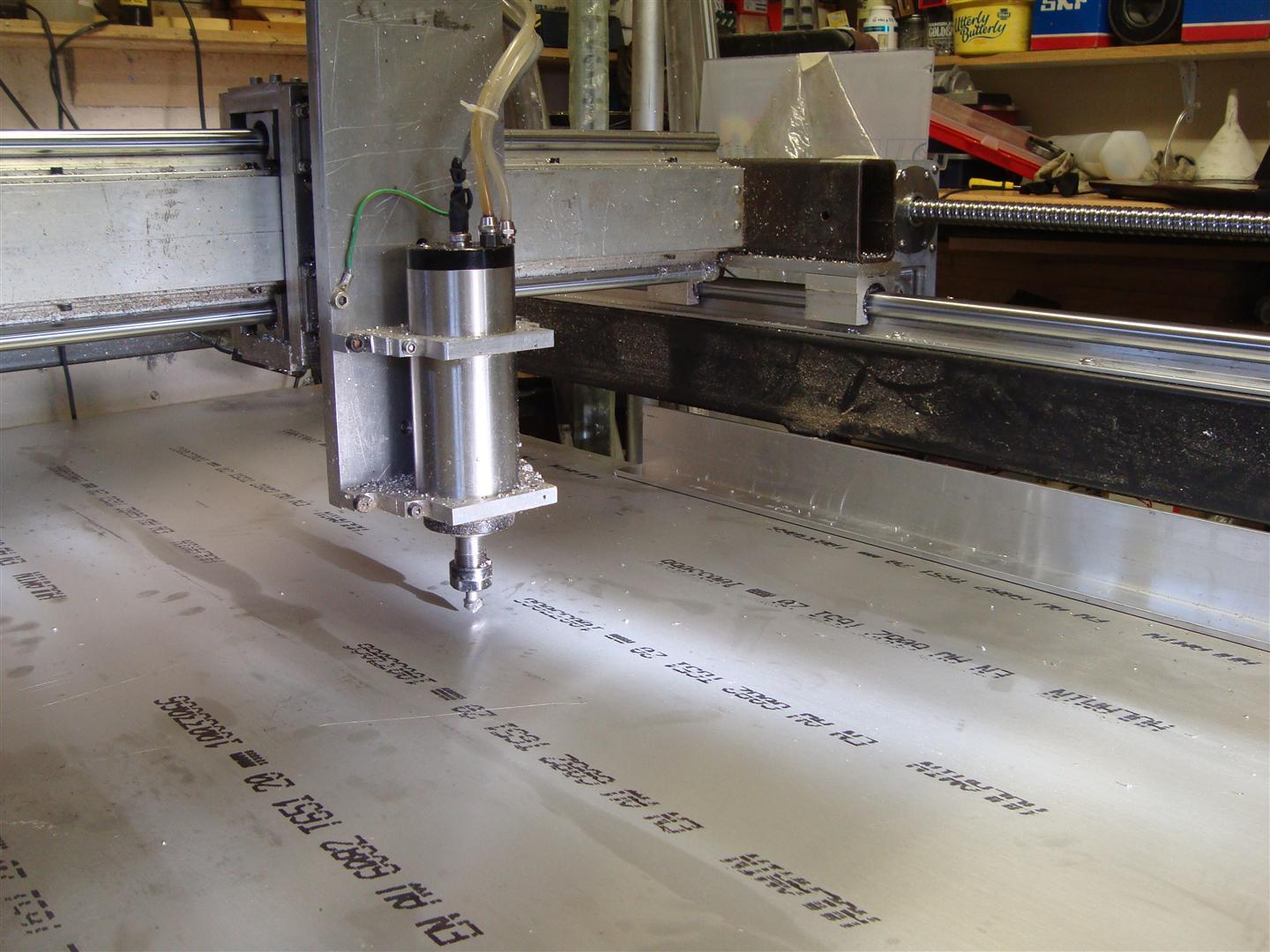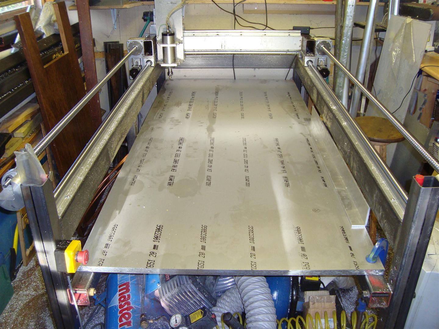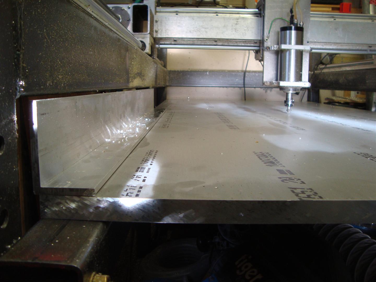 I'll be fixing 20 meters of 2"x1/2" aluminium strip under the bed in a grid to make it a bit stronger, since it's only 20mm thick aluminium. I've got 6m of the aluminium angle to go round the perimeter to enclose flood coolant, which will be the next upgrade. I'll have the router drill an array of holes to tap M8 for clamping. I elected not to go for strips (to imitate T-slots) as the difference in price is not that great in the whole scheme of things and this should be stronger although either would have been sufficient. Need to get it at the right height too...
