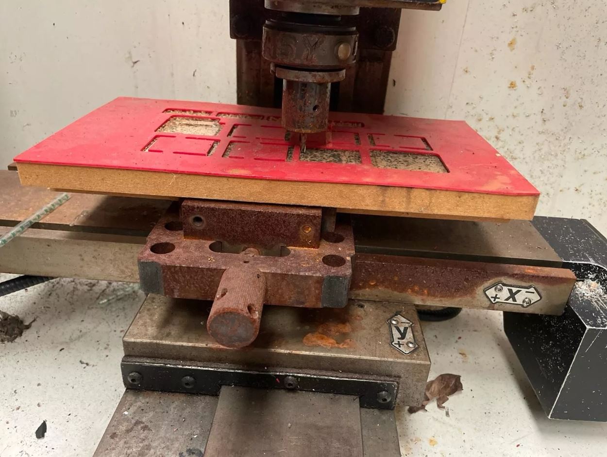 With the rogue ball screws sorted and the wonky tooling tamed, I turned my attention to the control panel. The old one was a sorry sight—rusty and bearing scars from what looked like a minor electrical tantrum. Several components on the back had, shall we say, “vigorously disassembled” themselves at some point. The new panel needed to be a proper job: an MPG dial, feedrate and spindle override controls, plus manual switches for spindle and coolant.