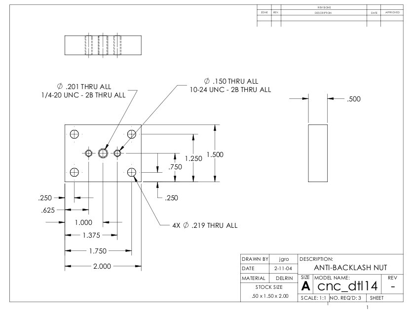 Hi Nathan many thanks for your post and can I take you up on that ? Ok I've just had a browse on e-bay for Delrin and there is loads of material available but can I ask what size should I be looking at ? It will hopefully drive a MDF made machine with a footprint size of 1 meter X 1/2 metre so how thick should the material be to make the nuts out of ? how would you recommend attaching them to the machines axis screws, glue or bolts ? Also what size hole will I need to drill for the tap to cut properly ? Also who are Dumpster CNC never heard of them, are they in the UK ? kind regards and sorry for all the dumb questions.