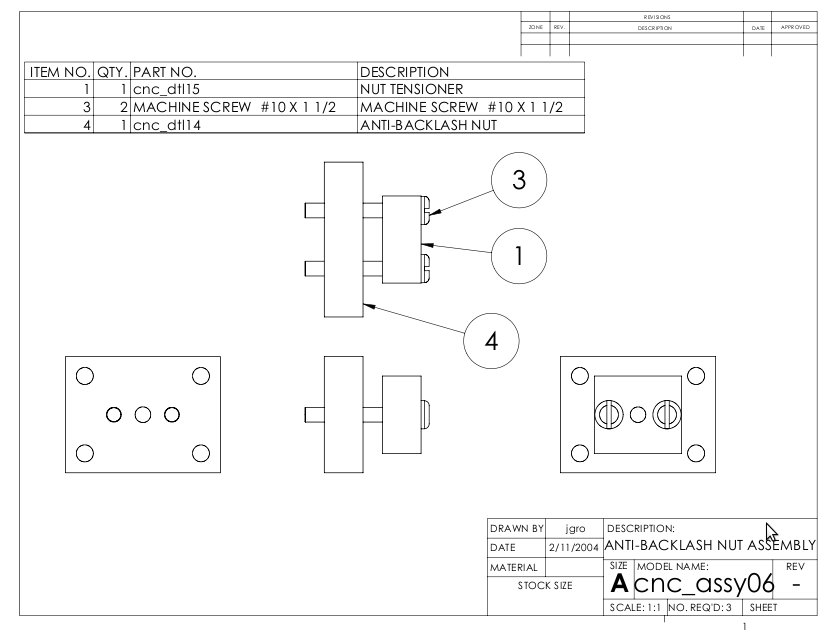 I used the JGRO design for the nut - I attached some pictures below (dimensions are in inches - and you would need to alter the dimensions for a 12X3 central hole). It uses two rectangular pieces of delrin (each around 12mm thick), you can adjust the tension between these two pieces via two bolts to reduce backlash. It would be easier though to just use a single thicker piece and not worry about backlash. These nuts are attached to the machine using four bolts.