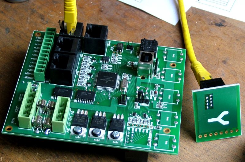 On the back 4 RJ45 sockets for 3 stepper drivers and 1 phase converter, 3 switched outputs, 6 buffered inputs, 1 USB socket and one header plug to connect one of those big fat positioning knobs. On the front an RJ45 for the pendant, a spindle speed knob, 5 push buttons and one concealed RST button.