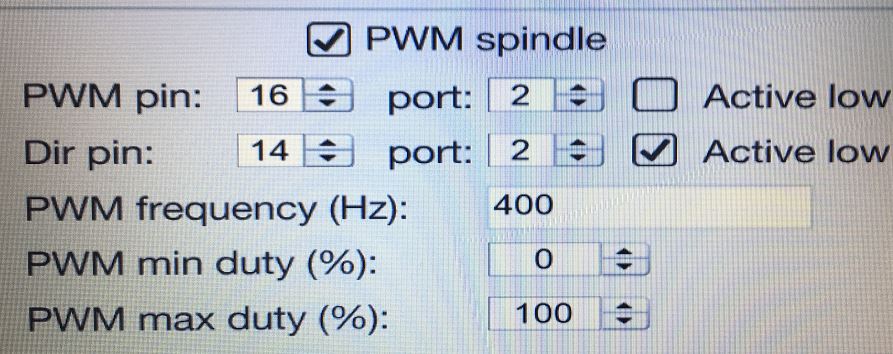 The software I use is UCCNC (purchased together with UC300 motion controller), and spindle settings are: